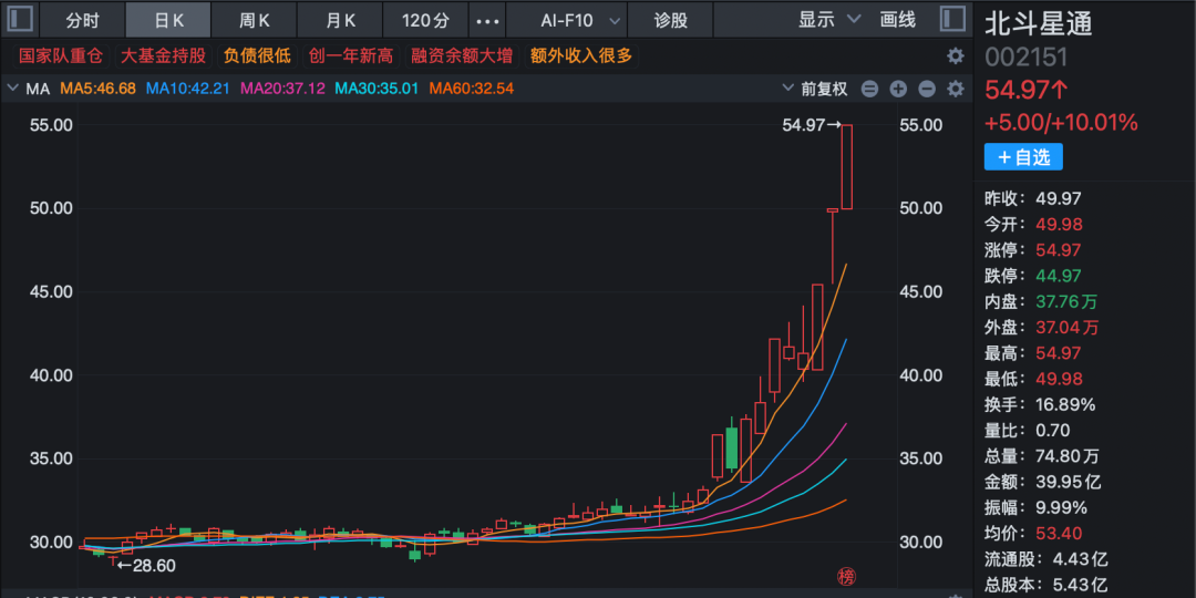 另一只商业航天板块个股北斗星通,在今日的异动公告中表示:已留意到近期市场对于商业航天概念关注度颇高,公司主营业务为卫星导航芯片、模组、天线、数据服务,下游应用场景包括测量测绘、智能驾驶、智慧农业、割草机器人、无人机等,商业航天仅为公司产品和服务的应用场景之一,提请投资者注意风险。