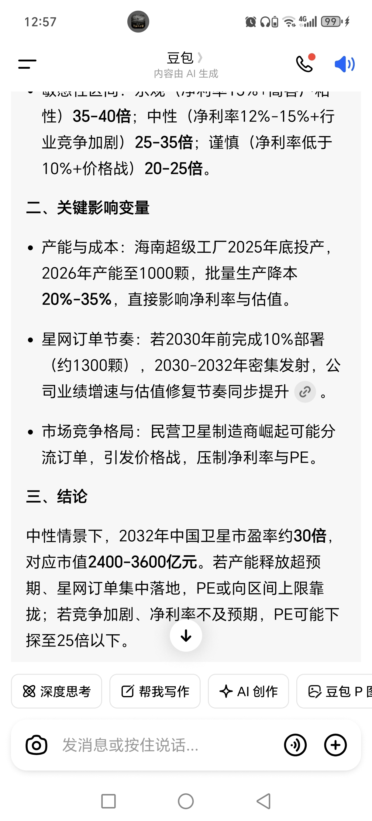豆包结论,2032年市值2400亿至3600亿,市盈率25倍。所以,现价只是中国