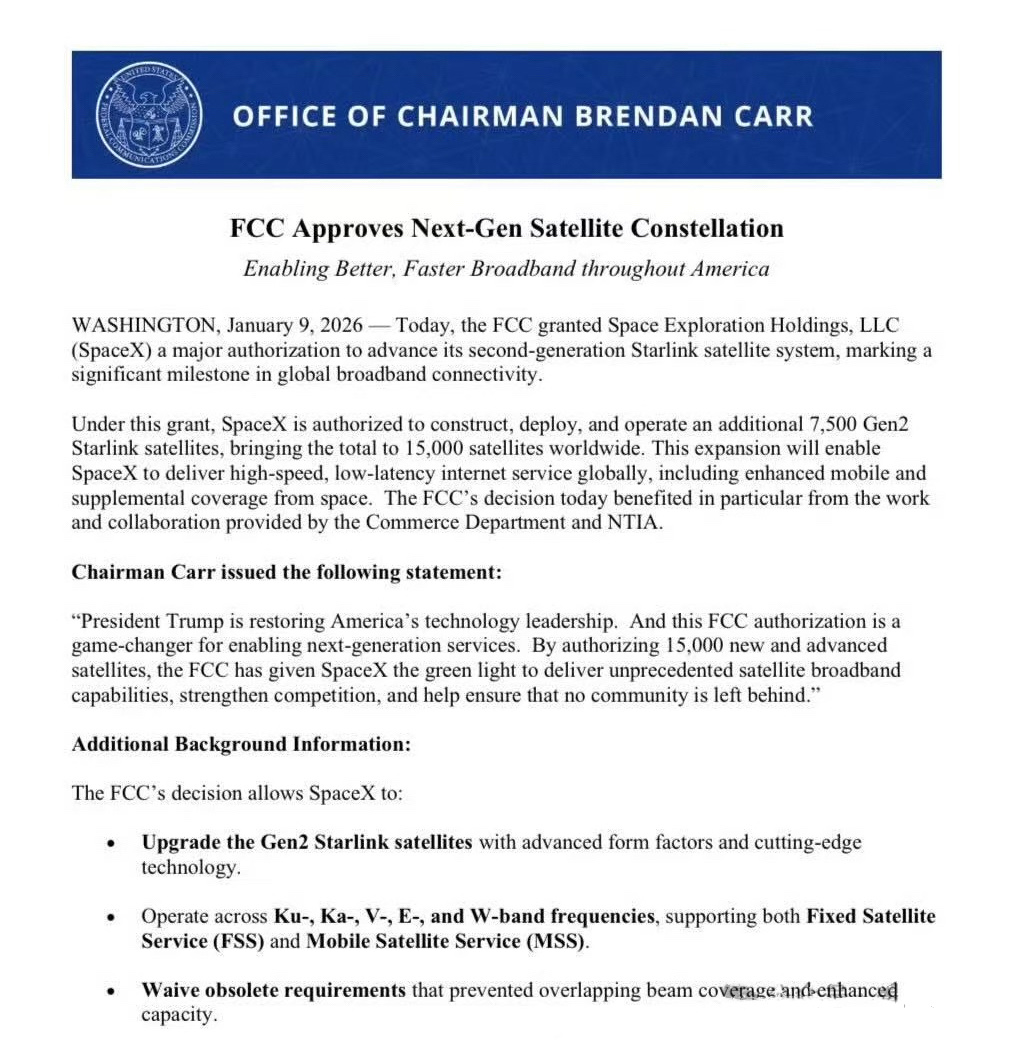 【美国联邦通信委员会(FCC)批准为SpaceX建设下一代卫星网络,授权SPACEX推进星链系统】 01月10日06:12:26