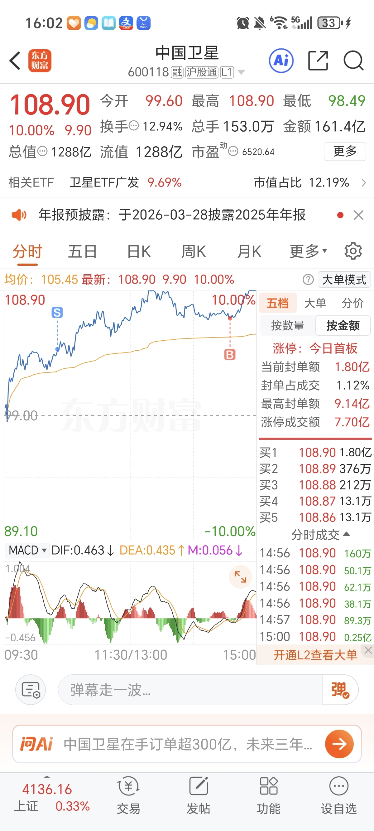 $中国卫星(SH600118)$ 早上104.5全仓卖的,卖飞了,106.5半仓接回来了,做了一个返T尾盘涨停,下周一低开,在接半仓回来