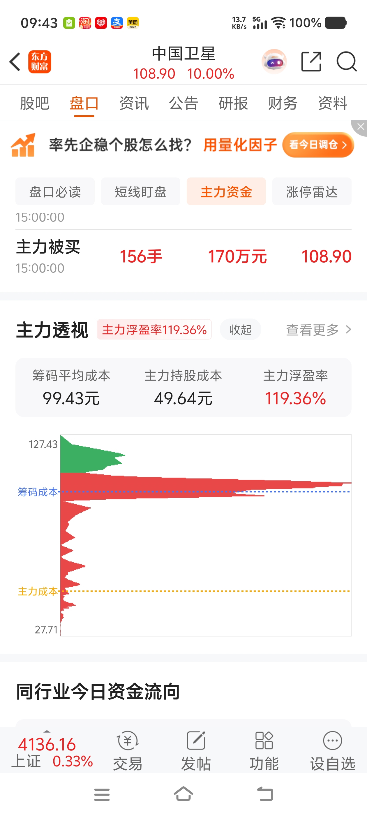$中国卫星(SH600118)$ 主力的利很高啊,成本才49元是这样吗