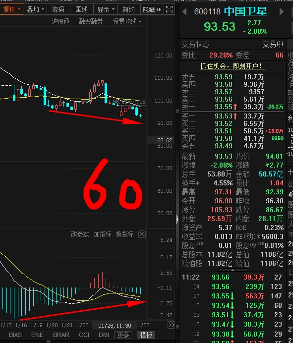 中国卫星再度破位,60分钟底部结构即将形成,大环境不好时,超级短线也要注意风险。