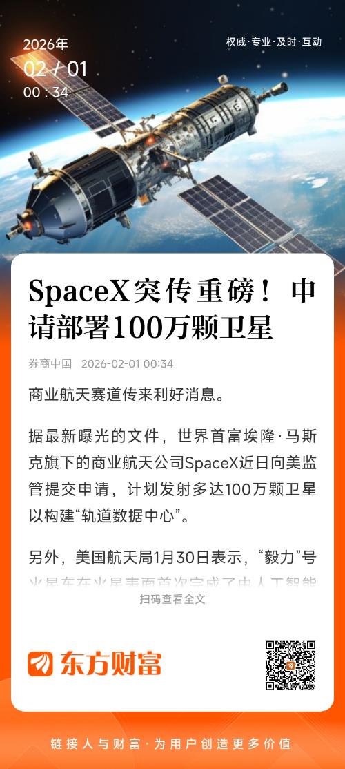 据美国《个人电脑杂志》网站1月31日报道,SpaceX公司于周五(1月30日)向联邦通信委员会(FCC)提交了相关申请文件,该公司计划发射多达100万颗卫星以构建“轨道数据中心”。