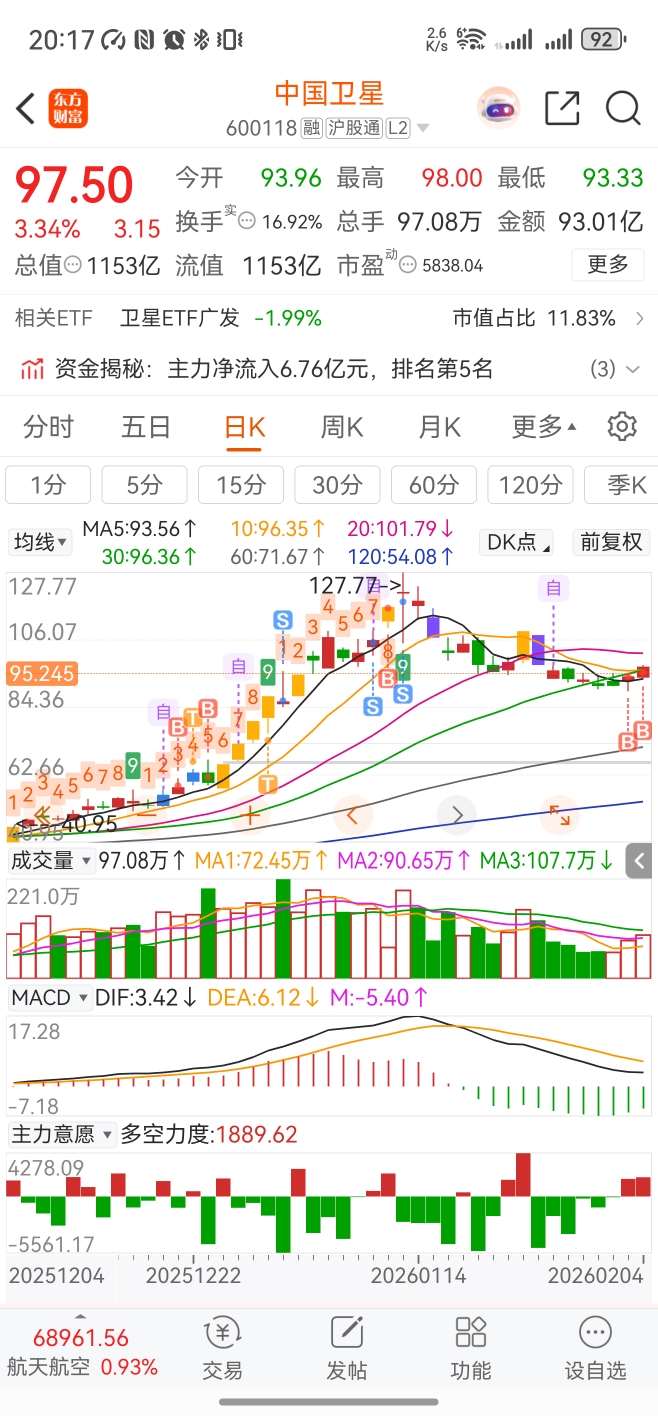 $中国卫星(SH600118)$ 118清仓,昨天今天进场