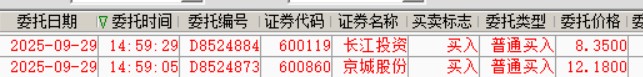昨天长江8.18压卖盘那3800的单被吃掉后,回落一次均价错过一个买点,挂8.25没赶上,然后看着它一直上尾盘都8.34了,只能追着买,今天就打个短线卖掉。。。早盘比手速偷个三维,希望节后起码还有3个点卖出哈~长江盘面很轻啊,手法拉起来超快,速战速决。。。准备炒借壳吗?。。。京城12.18是补仓哈