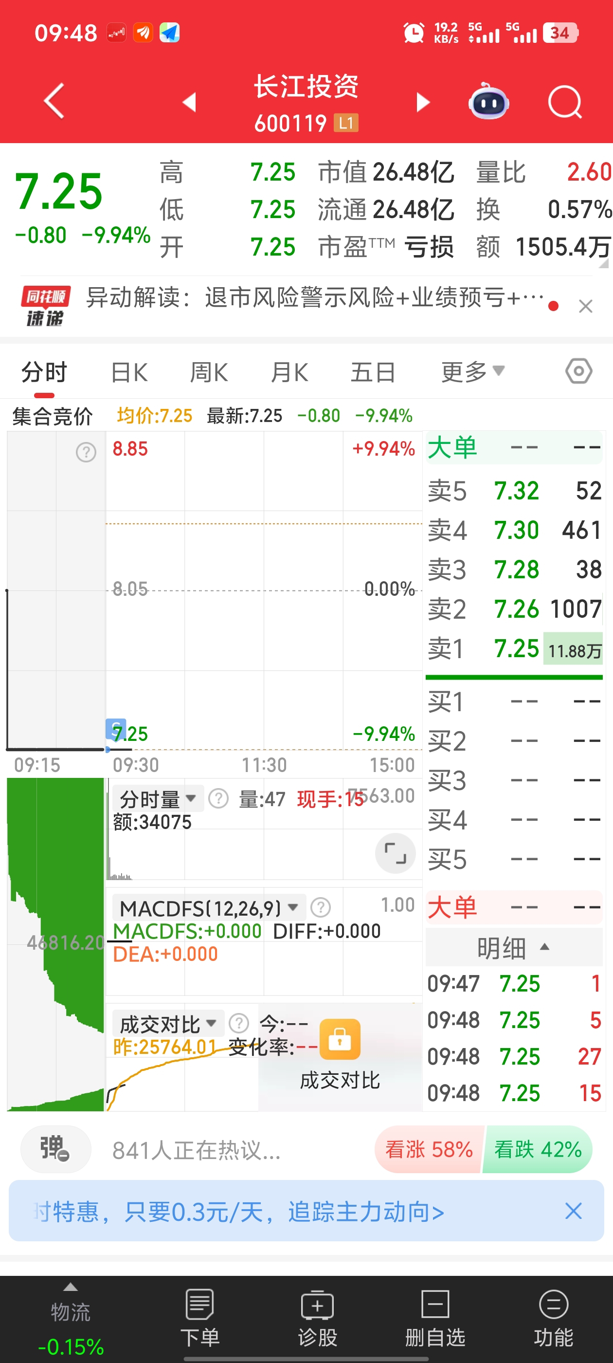 $长江投资(SH600119)$ 应该会开板,大家不用挂单了