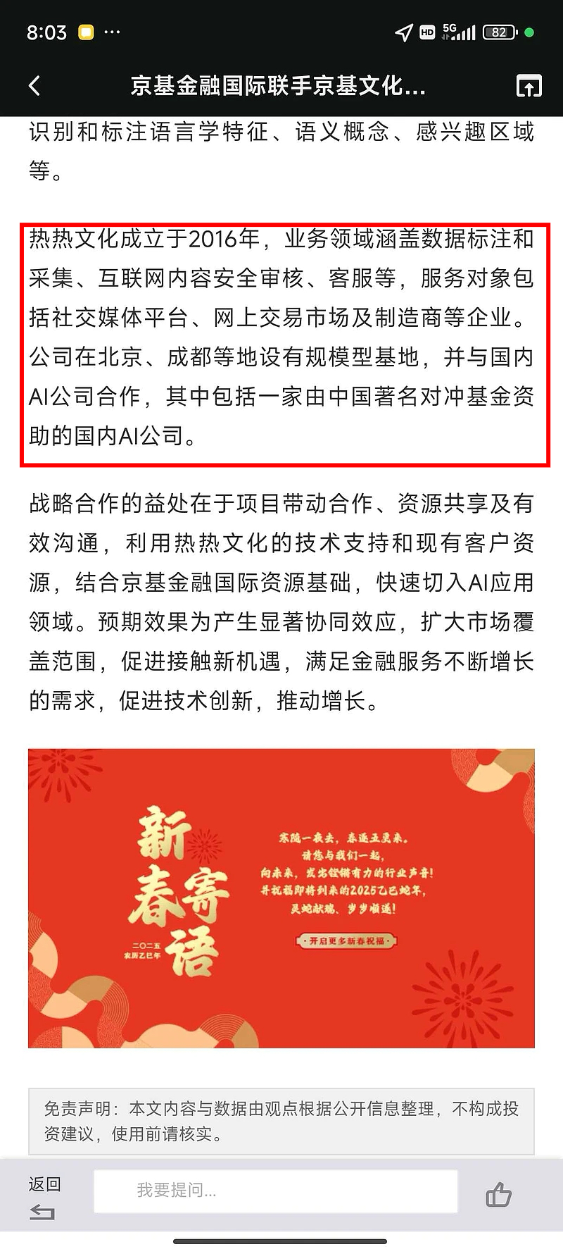 $浙江东方(SH600120)$ 港股上市公司京基1月28日官方公告中提到热热文化(汇洲智能全资子公司)合作deepseek。目前a股唯一实锤合作方。