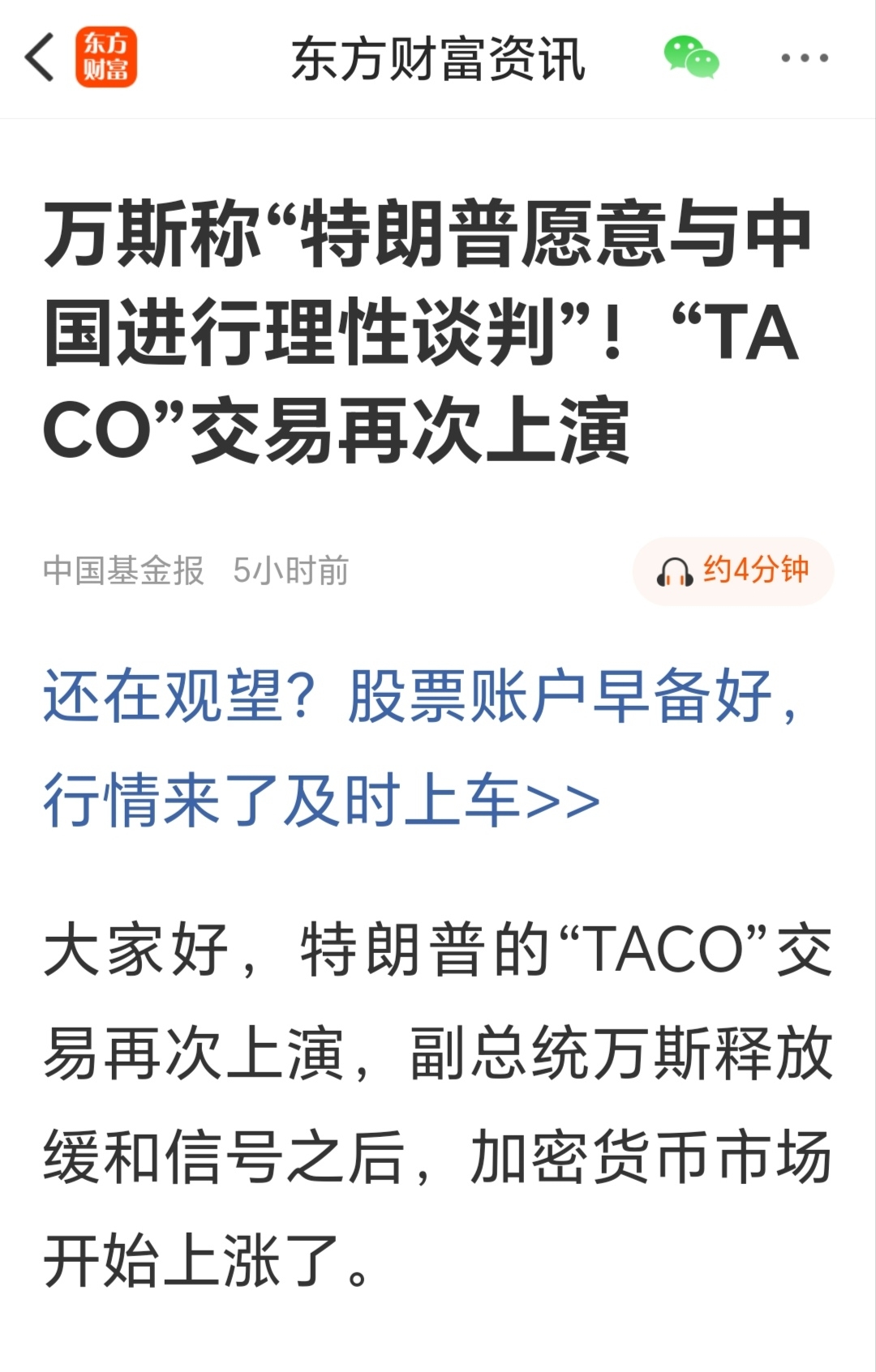 $浙江东方(SH600120)$ 万斯说话了,说特朗普愿意和我们理性谈判。加密货币加速反弹,美三大期指全部上涨。