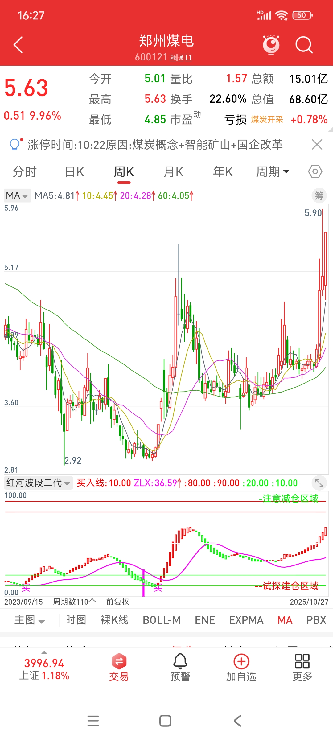$郑州煤电(SH600121)$ 这票和你们说过,现在是走周线行情,周线一路红柱延续,说明看涨不变,毕竟红柱不停,上涨不止,红柱拉长,加速不止,继续冲