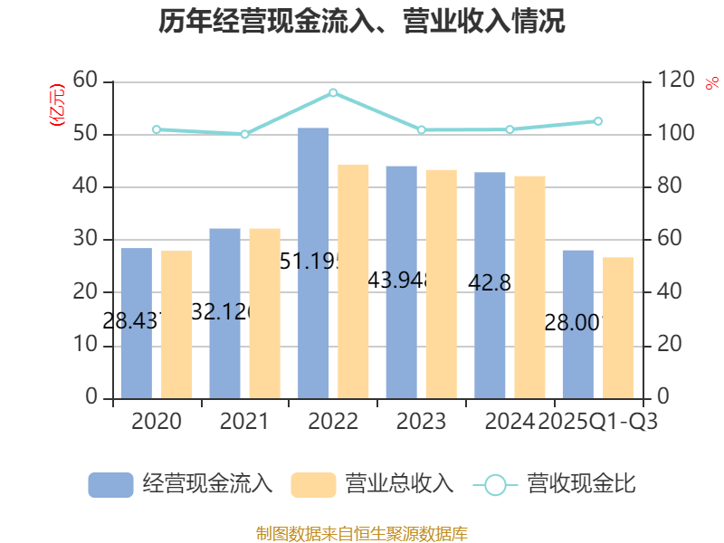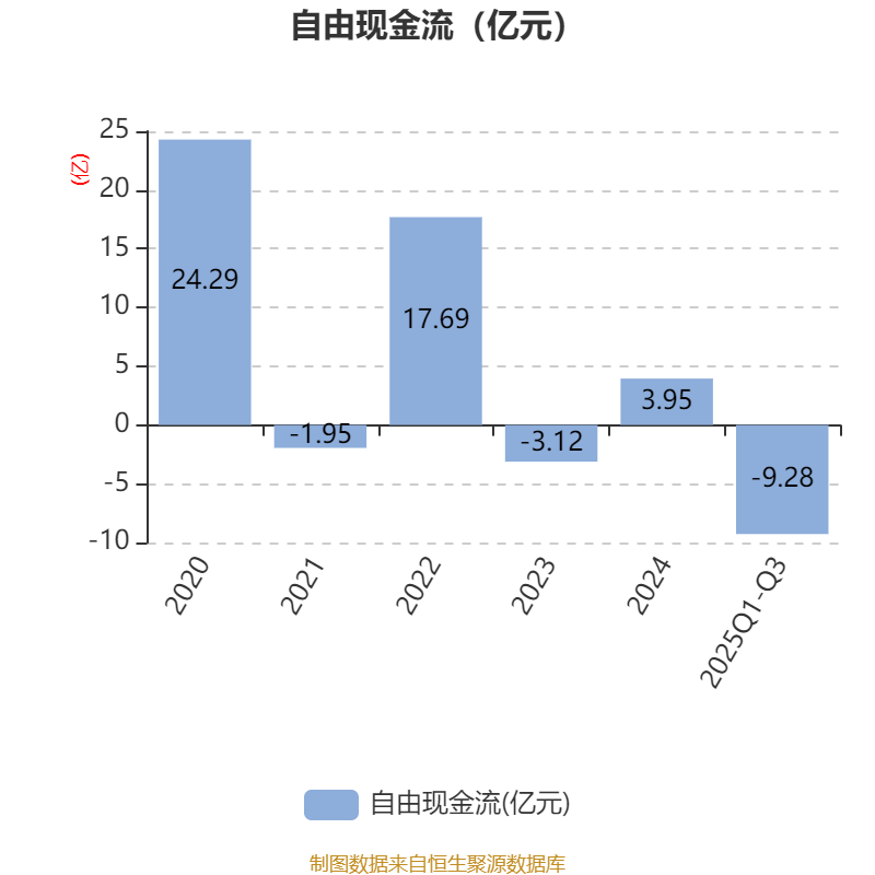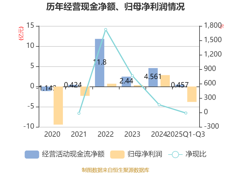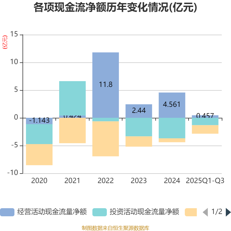 2025年前三季度,公司经营活动现金流净额为4569.67万元,同比下降86.21%;筹资活动现金流净额-1.53亿元,同比减少1.59亿元;投资活动现金流净额-1.33亿元,上年同期为-1.54亿元。