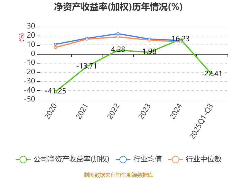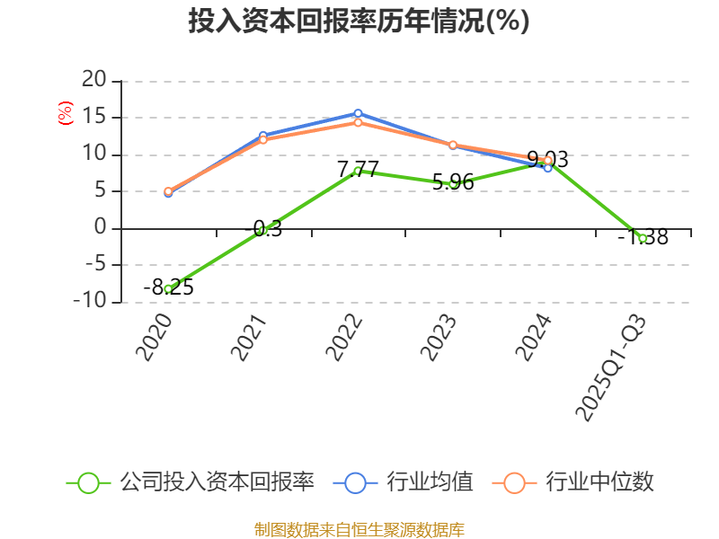盈利能力方面, 2025年前三季度公司加权平均净资产收益率为-22.41%,同比下降23.21个百分点。公司2025年前三季度投入资本回报率为-1.38%,较上年同期下降4.06个百分点。