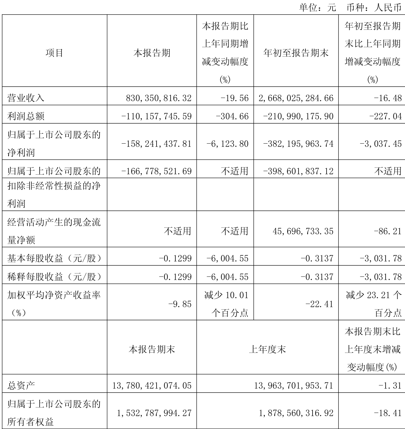 中证智能财讯郑州煤电(600121)10月31日披露2025年第三季度报告。前三季度公司实现营业总收入26.68亿元,同比下降16.48%;归母净利润亏损3.82亿元,上年同期盈利1301.12万元;扣非净利润亏损3.99亿元,上年同期亏损177.24万元;经营活动产生的现金流量净额为4569.67万元,同比下降86.21%;报告期内,郑州煤电基本每股收益为-0.3137元,加权平均净资产收益率为-22.41%。