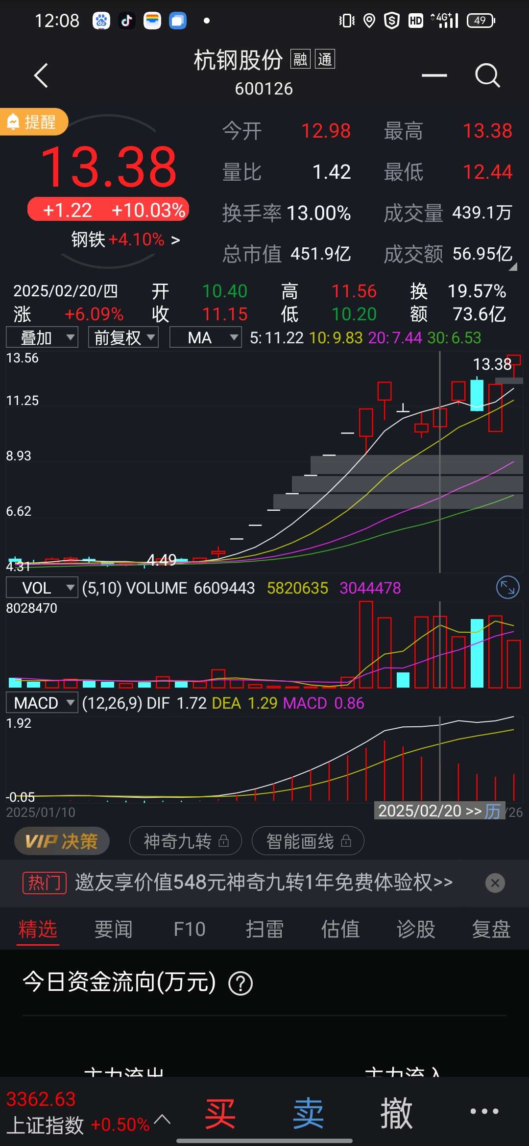 今天早盘杭钢股份高开6.77%,盘中高位多空来回博弈,上午11.16分成功封涨停,封单将近56万,它从低点4.76元涨到今天的13.38元,将近2.81倍,看趋势它已经突破前高,有开启第二波主升浪的潜力。