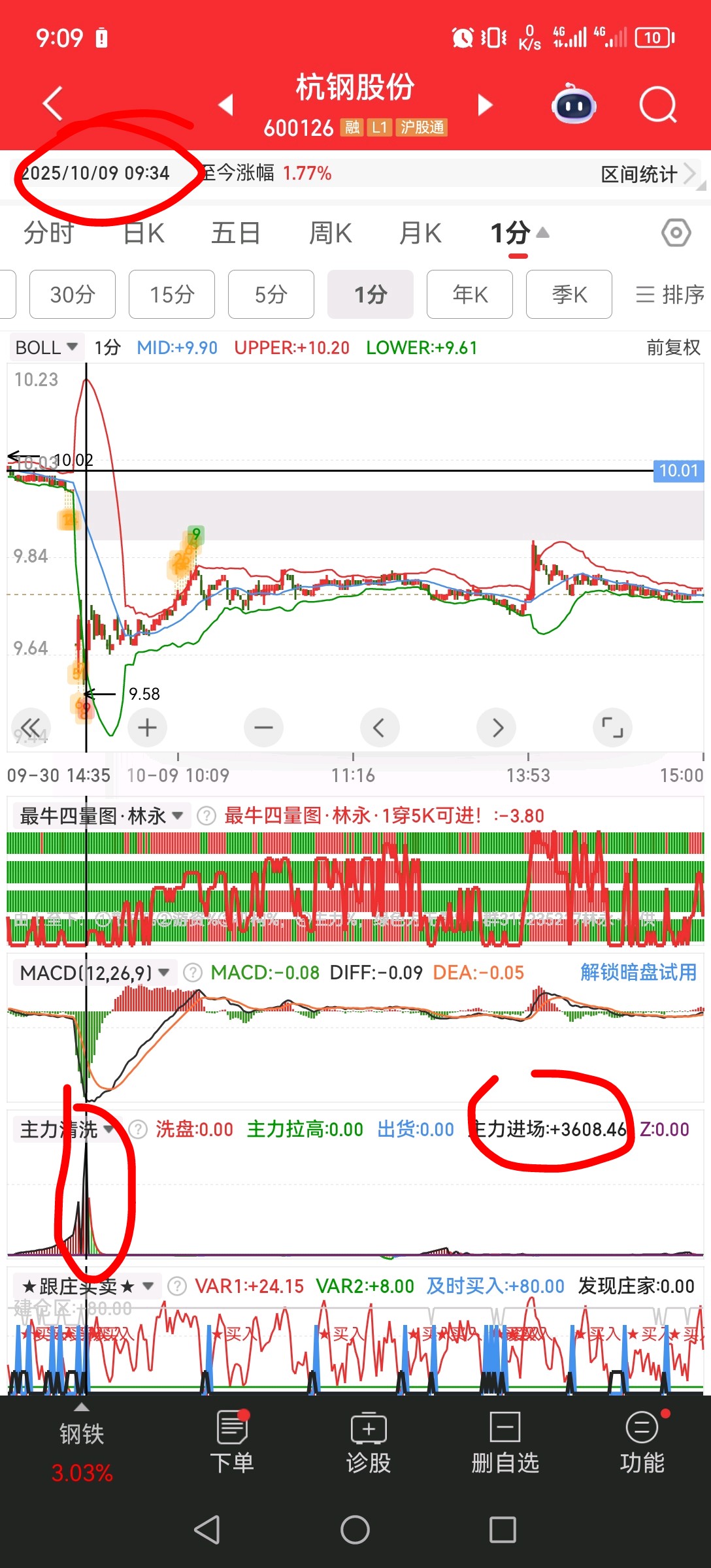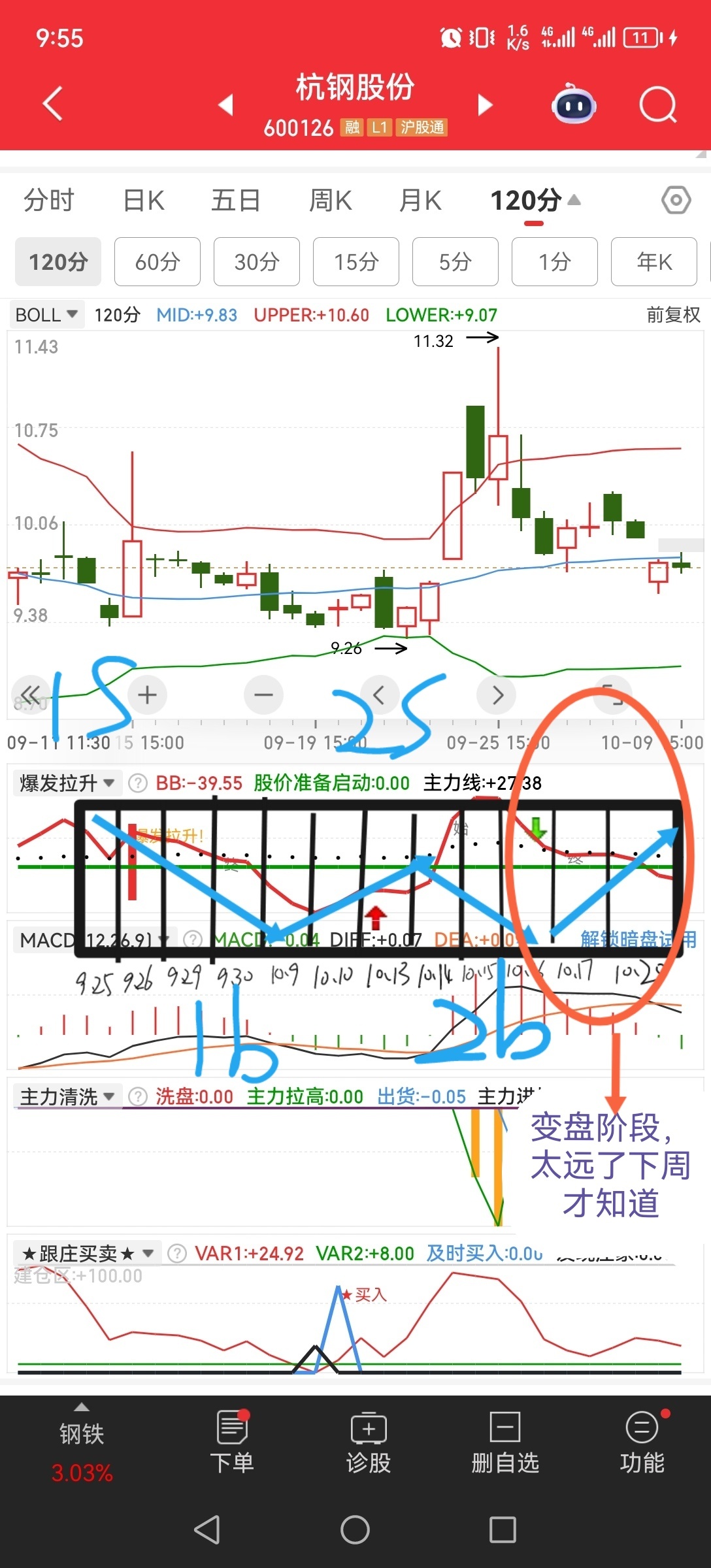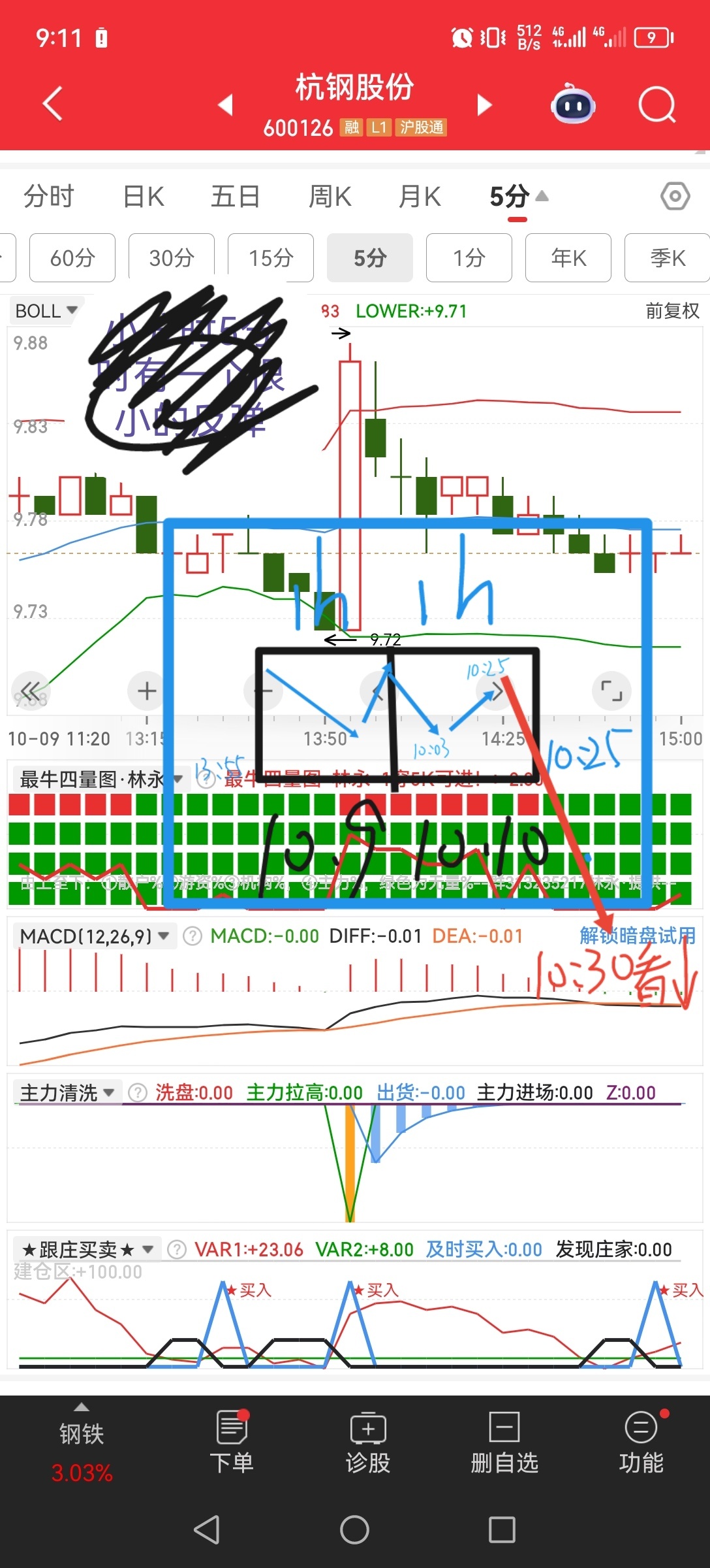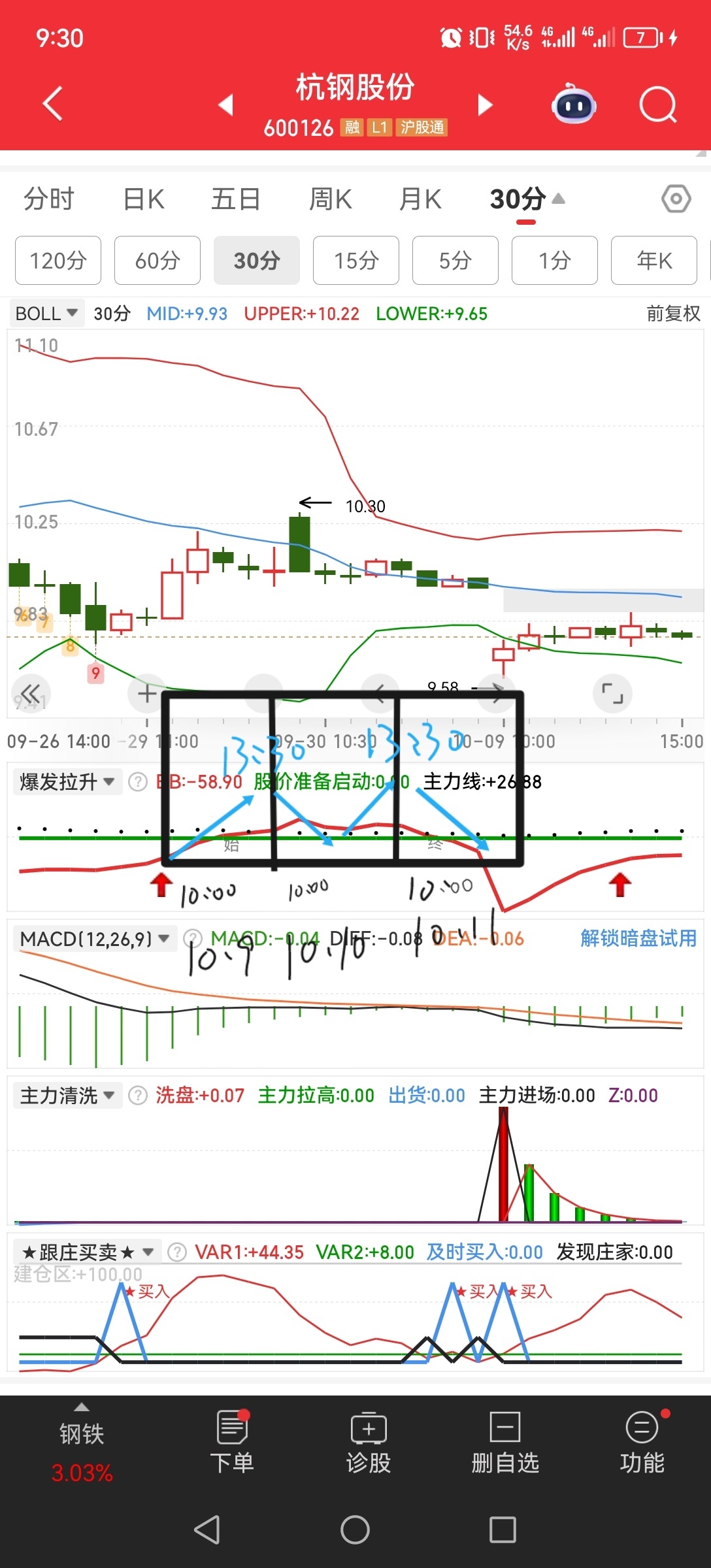 还有这个30分时下跌如果破位跌破9.58,又要重新构建低位信号,走m底震荡