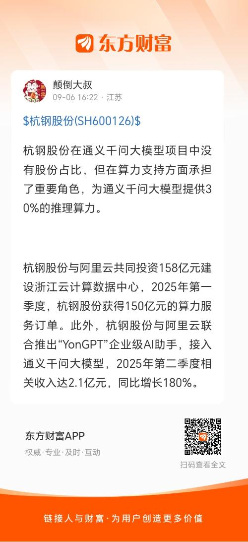 杭钢股份与阿里云共同投资158亿元建设浙江云计算数据中心,2025年第一季度,杭钢股份获得150亿元的算力服务订单。此外,杭钢股份与阿里云联合推出“YonGPT”企业级AI助手,接入通义千问大模型,2025年第二季度相关收入达2.1亿元,同比增长180%。