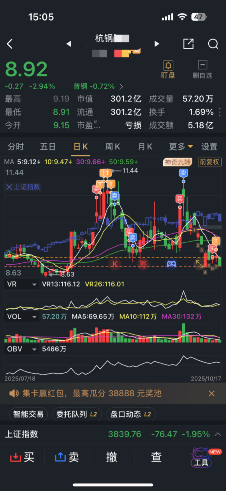 $杭钢股份(SH600126)$ 今天这个大盘刚好就检验了刚子,目前就是阶段性的底部,大盘跌成这样它才跌两三个点,要是上五个点我直接就走了,今天跌五至十个点的偏地都是,因为看不清内在所以你们才慌,庆幸今天刚子才跌这点吧