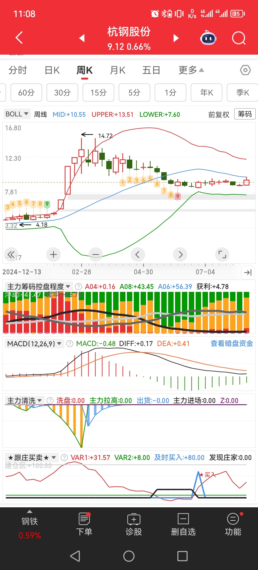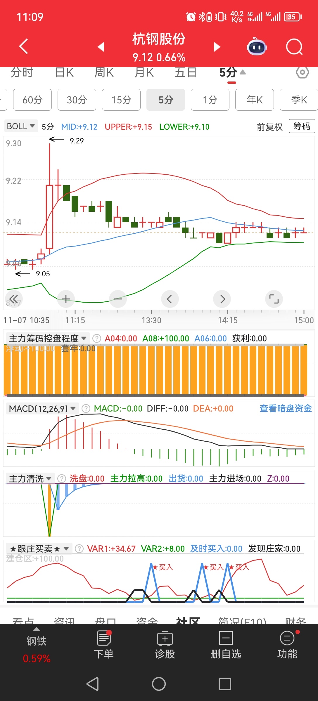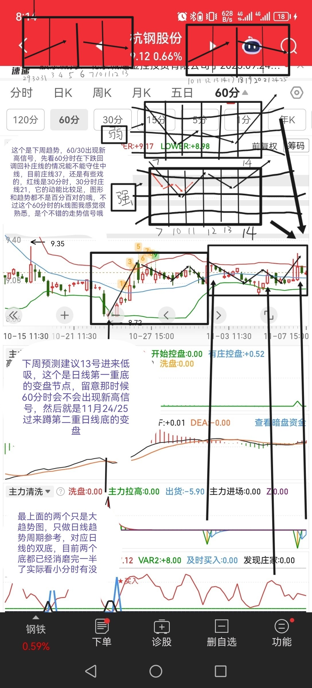 $杭钢股份(SH600126)$ 120变盘节点11:30已到,日线会重复120分时boll线的走势,再震荡12天,会有大动作哦,短期可以边涨边撤退,下下周要回来,目前会往上突破,消耗日/120动能,120分时庄线在67,昨天60,7个点升1个点抛压不大,日线庄线55,昨天40,15点换1个点利润(还有下半场)15/30/60分时庄线都相爱中低位,目前看1-2天可以长拿,后面见高位就6