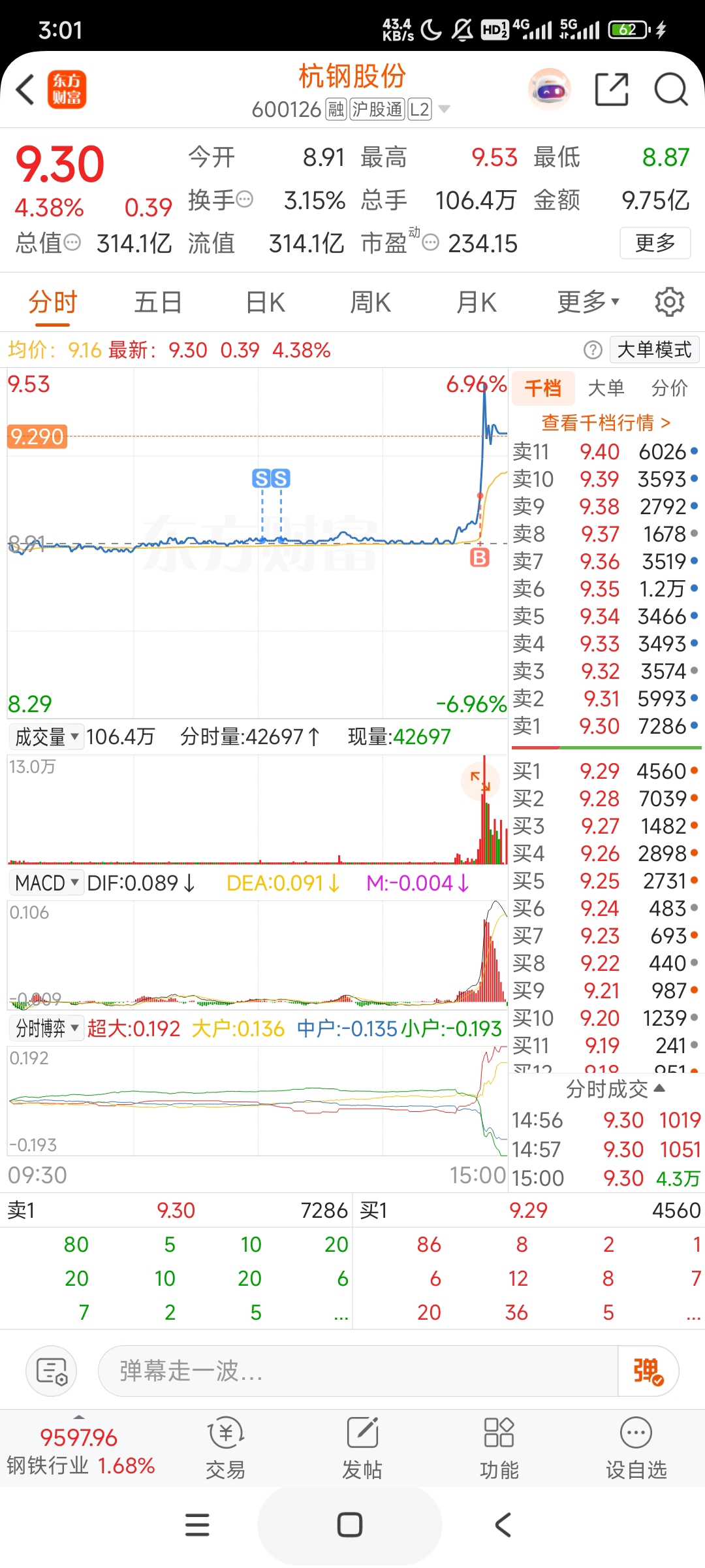 $杭钢股份(SH600126)$ 难受。。。今天全做了反T。。。。