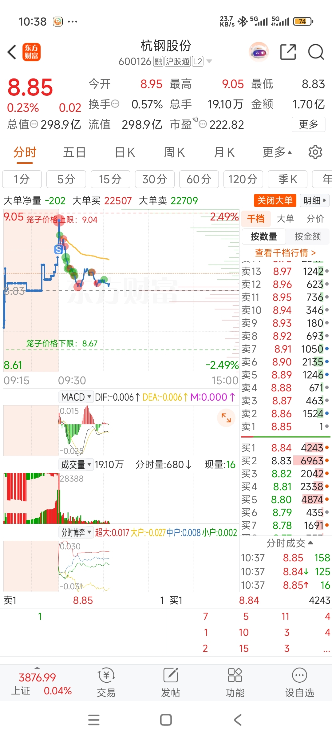 $杭钢股份(SH600126)$ 已走,待低点入8.8,数据港不敢走,涨停就出$数据港(SH603881)$