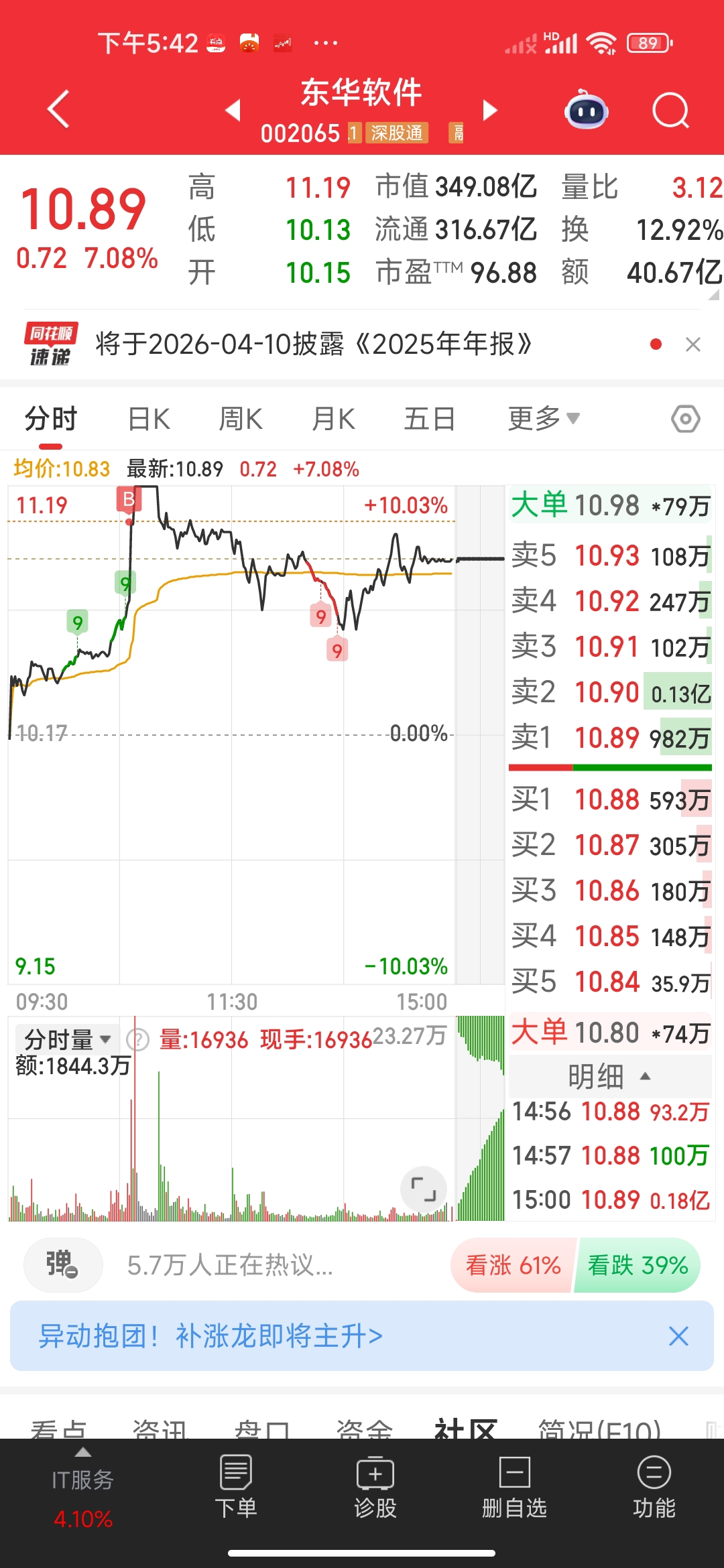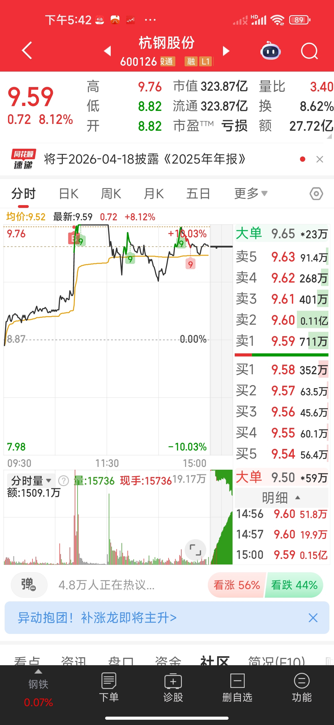 今天打板的杭钢股份,东华软件两只个股都开板了,主力实力也不行,前面抛压也大,这个