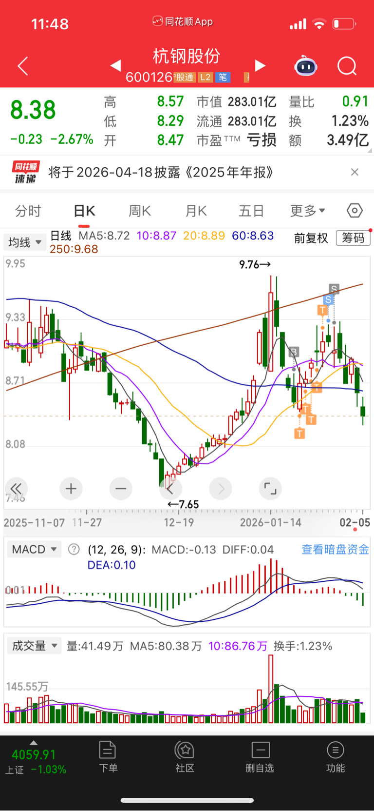 $杭钢股份(SH600126)$ 8附近 等我做好消费回来。乖乖!