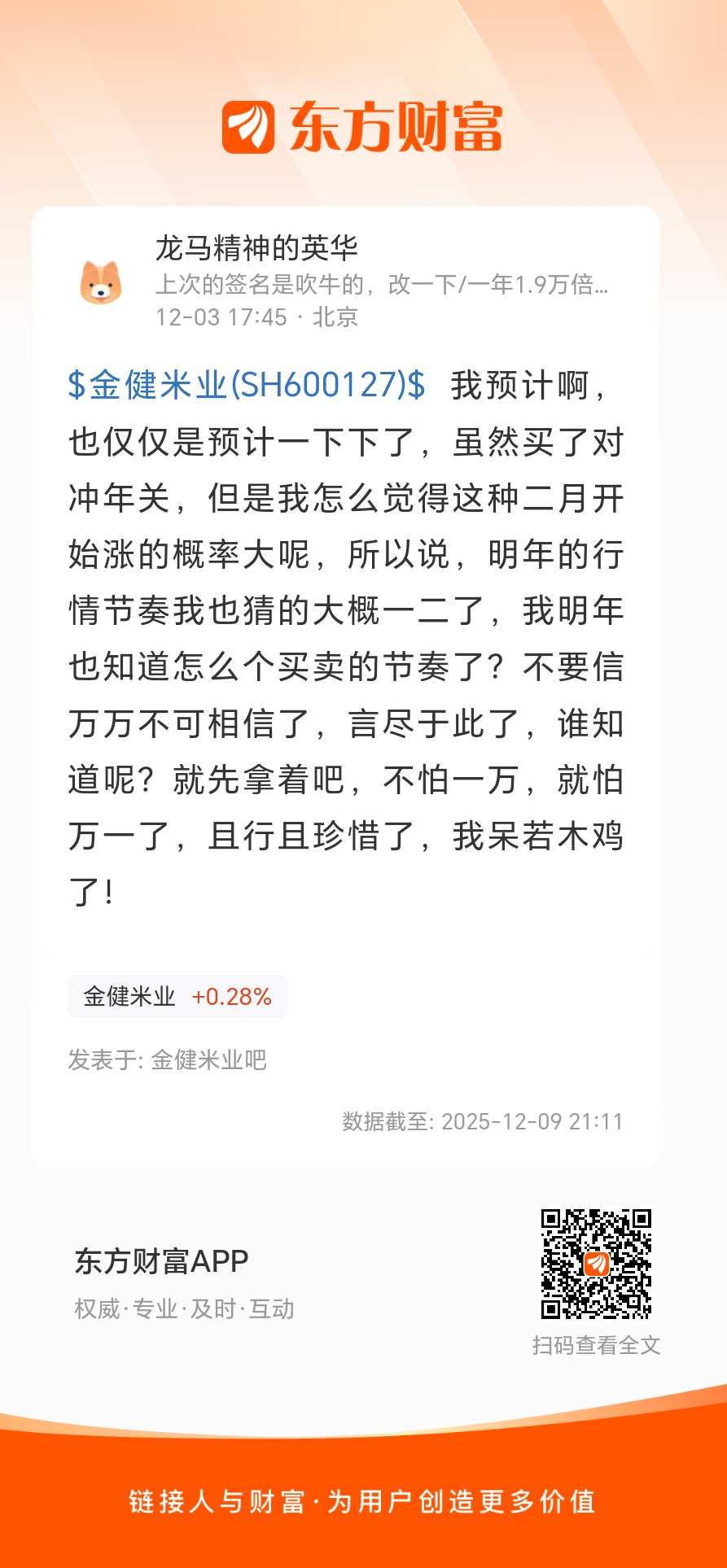 $金健米业(SH600127)$ 我预计啊,也仅仅是预计一下下了,虽然买了对冲年关,但是我怎么觉得这种二月开始涨的概率大呢,所以说,明年的行情节奏我也猜的大概一二了,我明年也知道怎么个买卖的节奏了?不要信万万不可相信了,言尽于此了,谁知道呢?就先拿着吧,不怕一万,就怕万一了,且行且珍惜了,我呆若木鸡了!