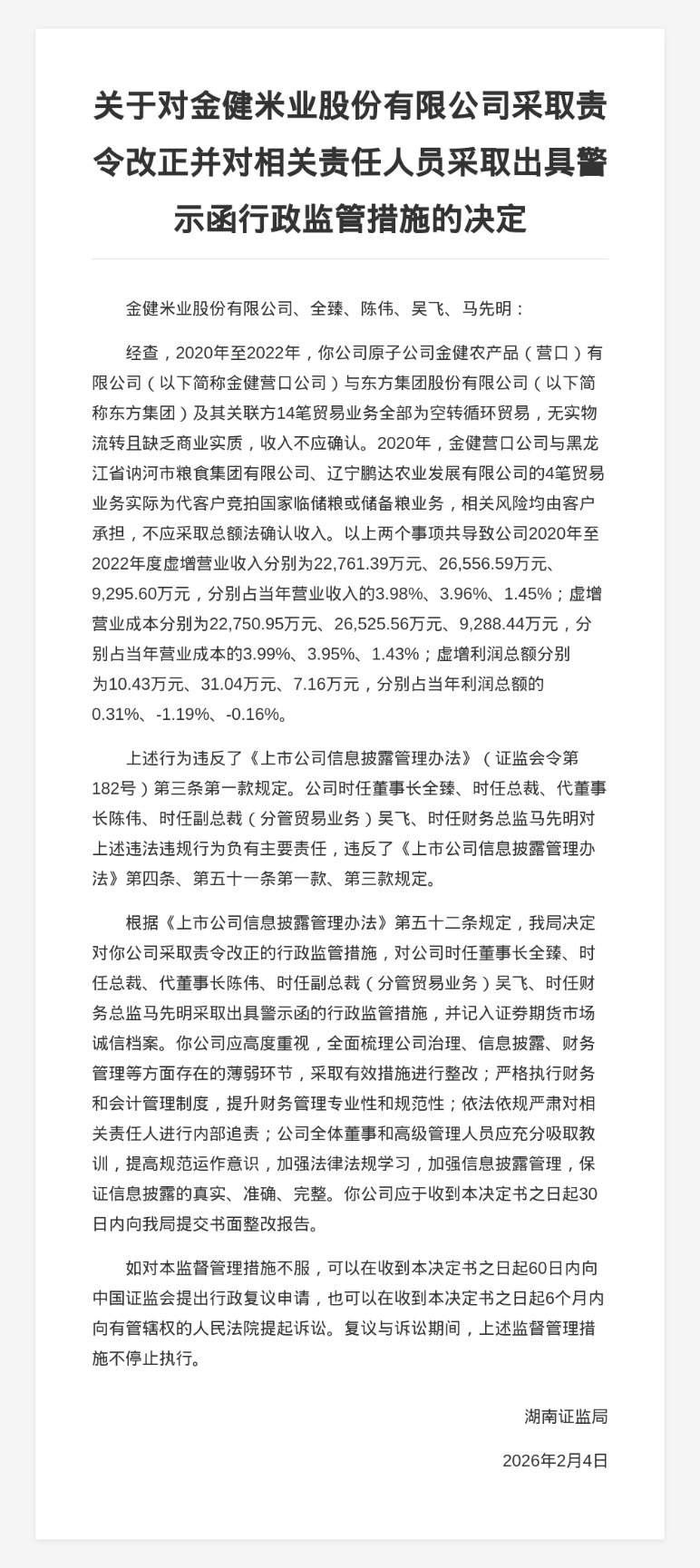对此,湖南证监局决定对金健米业股份有限公司采取责令改正的行政监管措施,对公司时任董事长全臻、时任总裁、代董事长陈伟、时任副总裁(分管贸易业务)吴飞、时任财务总监马先明采取出具警示函的行政监管措施,并记入证券期货市场诚信档案。