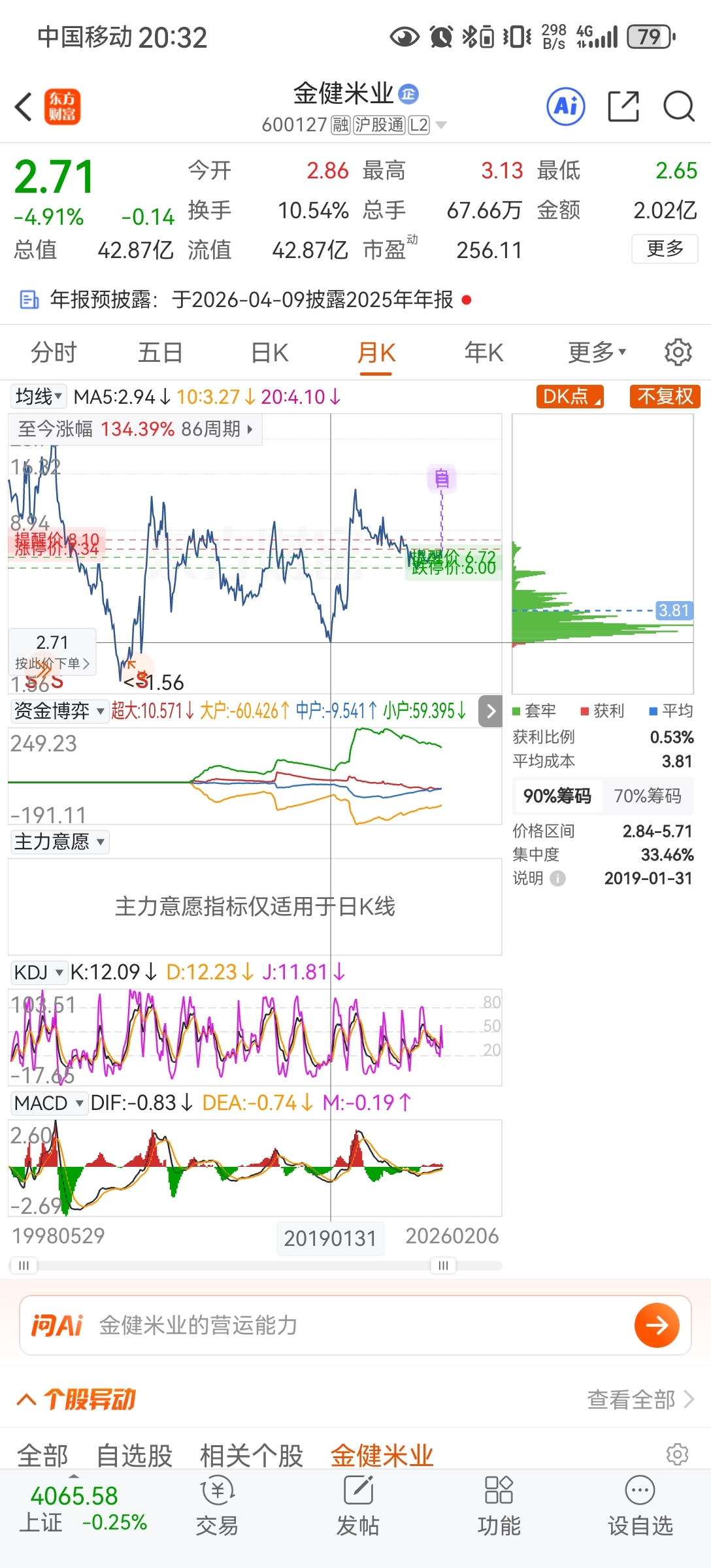 $金健米业(SH600127)$ 冲高一般是为了出货,然后开始一个阴跌两三年的缓慢过程,保守估计阴跌最后股价大约在之前的前低,2.77大差不差的顶多多估计一分钱加到2.78已经是主力发慈悲为怀了哈!