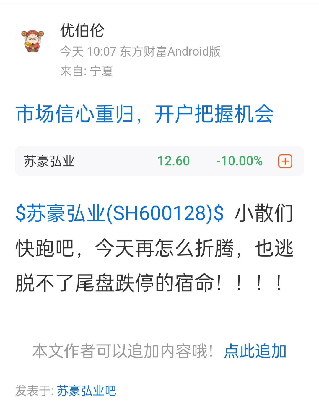 温馨提示: 1.根据《证券法》规定,禁止编造、传播虚假信息或者误导性信息,扰乱证券市场;2.用户在本社区发表的所有资料、言论等仅代表个人观点,与本网站立场无关,不对您构成任何投资建议。用户应基于自己的独立判断,自行决定证券投资并承担相应风险。《东方财富社区管理规定》