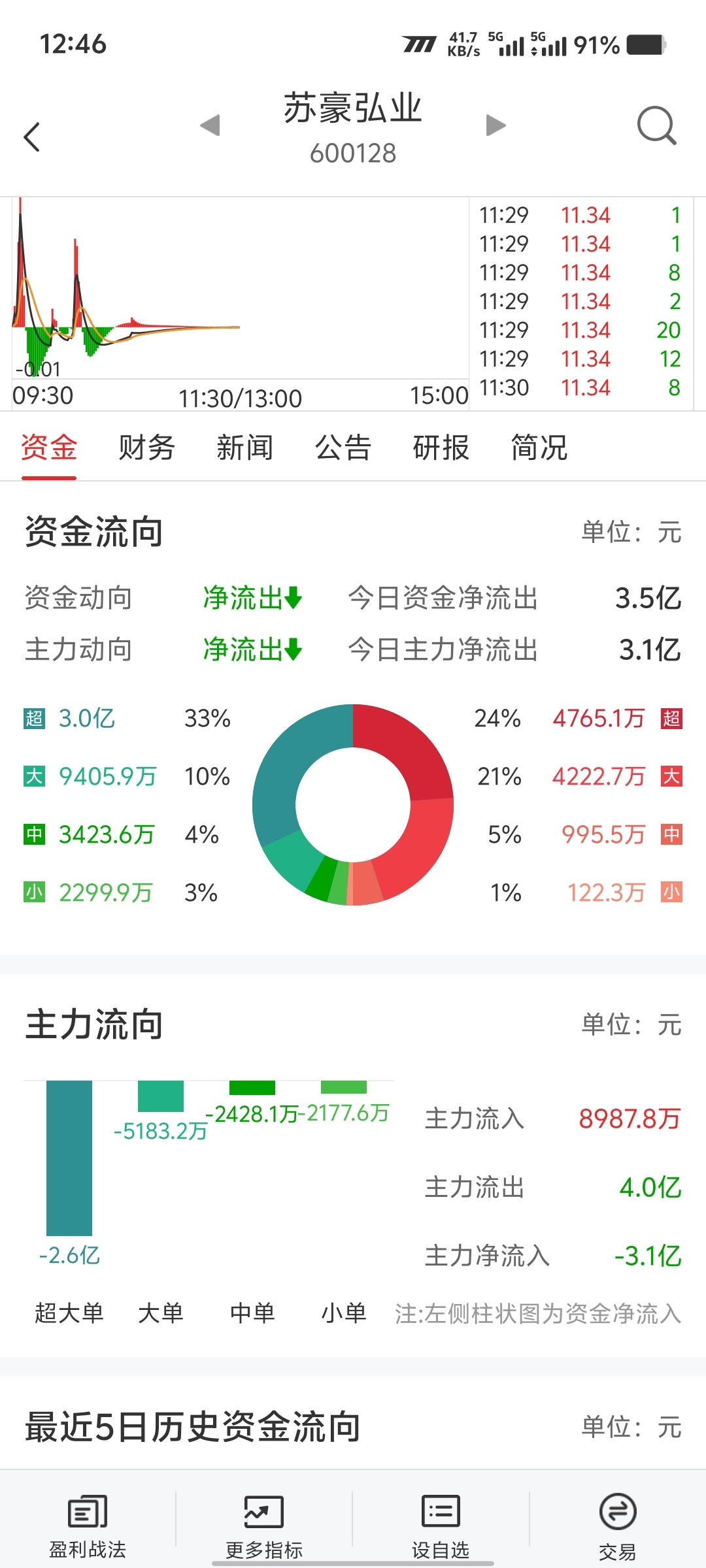 $苏豪弘业(SH600128)$ 自己看看主力在干嘛,跑了3个亿