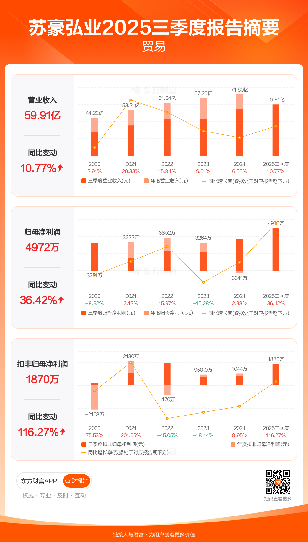 苏豪弘业10月31日发布2025年三季报显示,公司前三季实现营业收入59.91亿元,同比增长10.77%;归母净利润4971.93万元,同比增长36.42%;扣非归母净利润1870.30万元,同比增长116.27%。