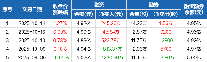 融资方面,当日融资买入3858.58万元,融资偿还3613.38万元,融资净买入245.2万元,连续3日净买入累计814.62万元。融券方面,融券卖出2.81万股,融券偿还1.25万股,融券余量14.23万股,融券余额318.47万元。融资融券余额合计4.95亿元。