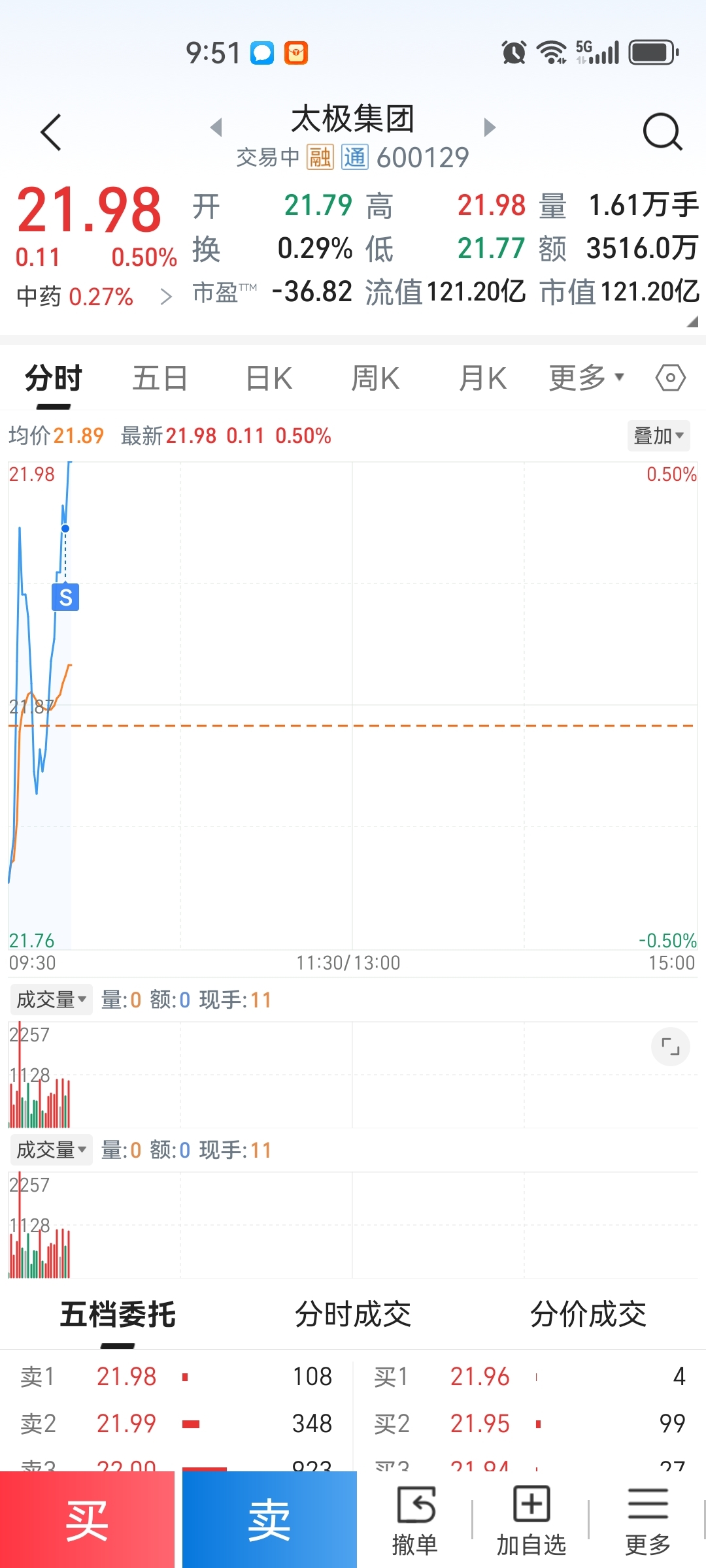 $太极集团(SH600129)$ 昨天21.57买的,今天21.97卖掉了。