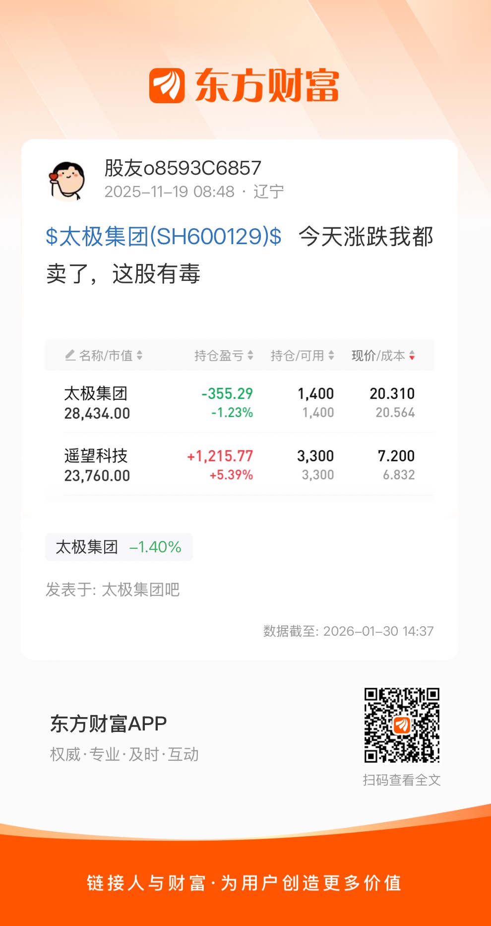 $太极集团(SH600129)$  今天涨跌我都卖了,这股有毒