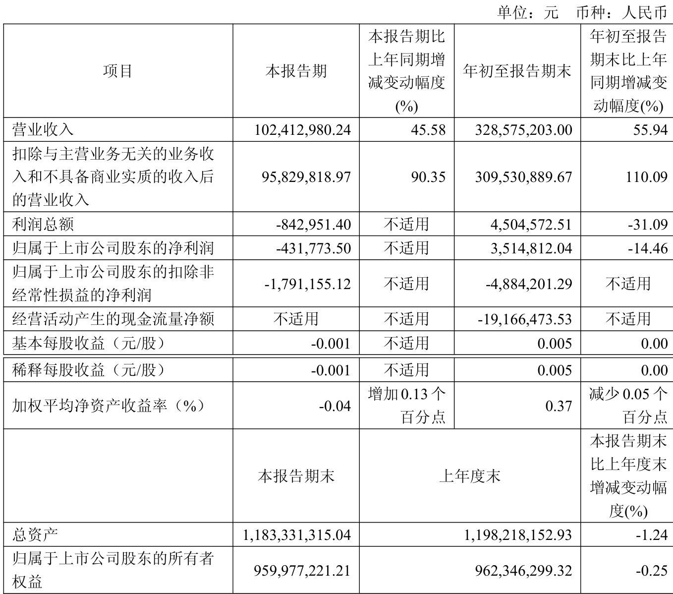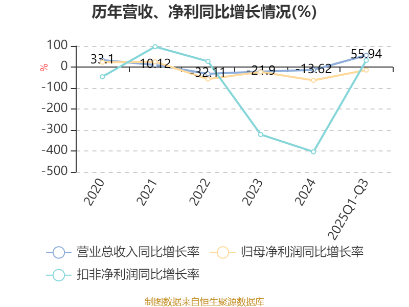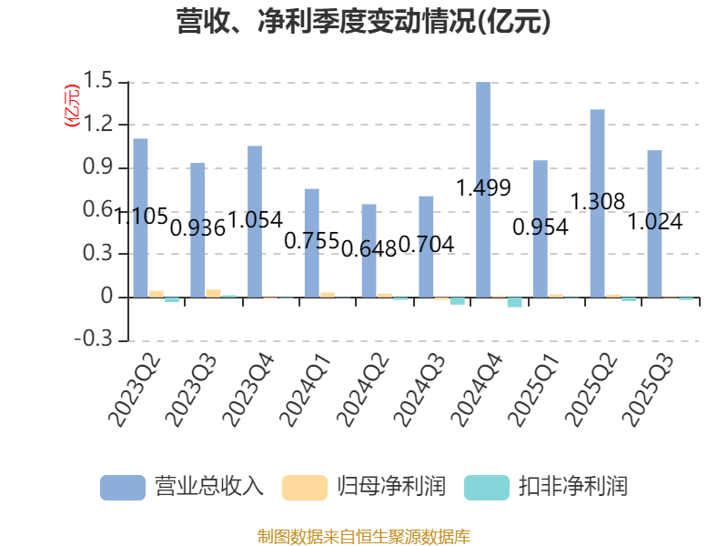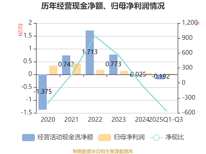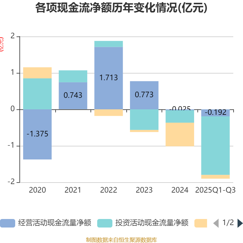 2025年前三季度,公司经营活动现金流净额为-1916.65万元,同比减少1409.51万元;筹资活动现金流净额-1039.01万元,同比增加5324.79万元;投资活动现金流净额-1.61亿元,上年同期为-2.3亿元。