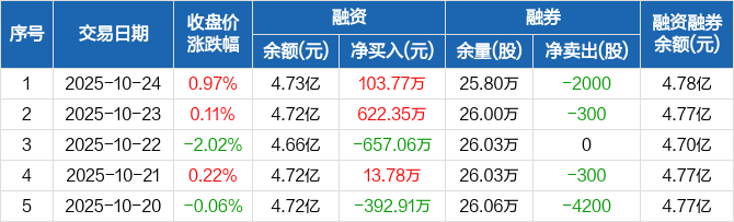 融资方面,当日融资买入1682.98万元,融资偿还1579.21万元,融资净买入103.77万元。融券方面,融券卖出0股,融券偿还2000股,融券余量25.8万股,融券余额455.63万元。融资融券余额合计4.78亿元。