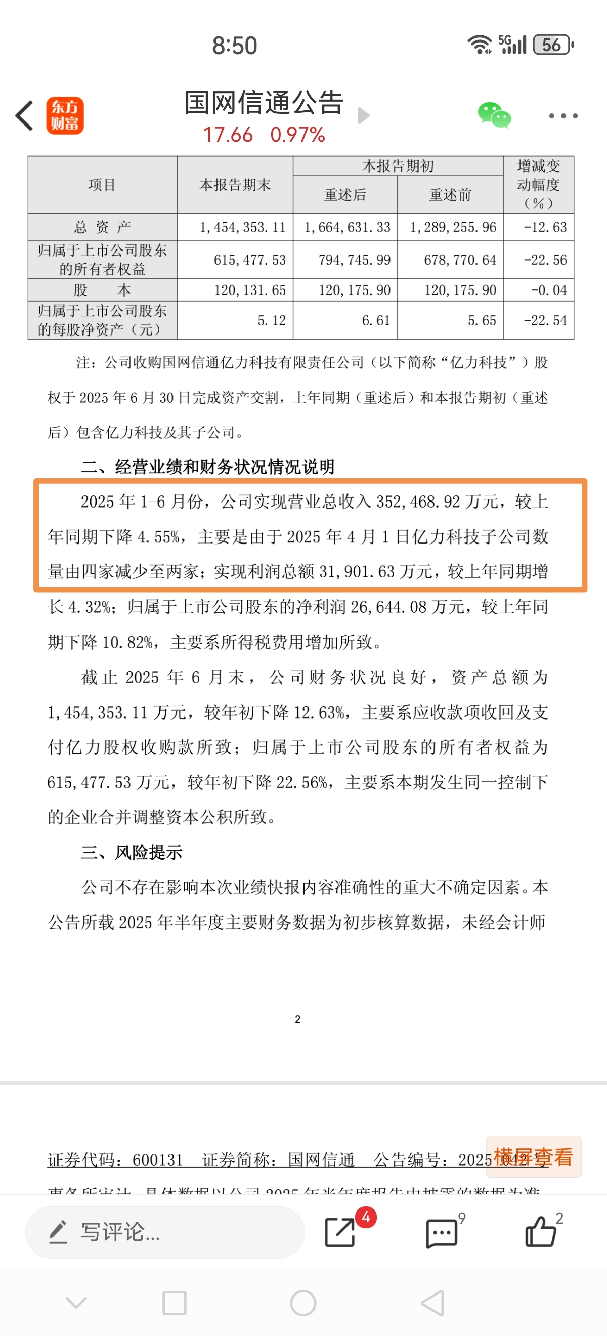 $国网信通(SH600131)$ 三季报业绩上涨,但同比和半年报一样,也可能是下降的,因为亿力技子公司数量由四家减少至两家,对比去年同期少了两家公司的营收和利润。