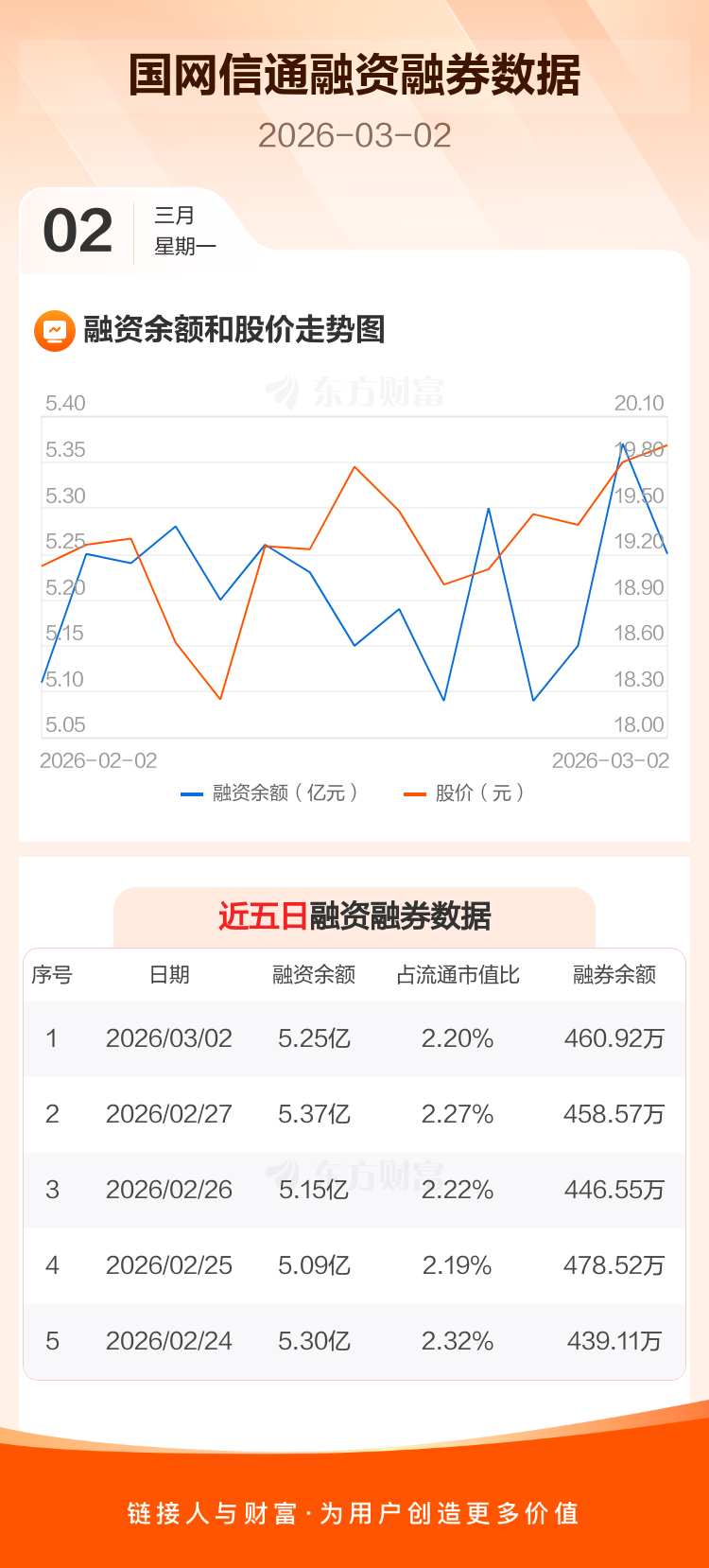 交易所最新数据显示,国网信通于2026年3月2日获融资买入4985.79万元,融资偿还6262.30万元,当日融资净偿还1276.51万元。目前,该股融资余额5.25亿,占流通市值比例为2.20%。