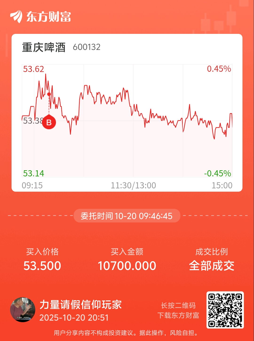 $重庆啤酒(SH600132)$ 日内买点选的太差,本来不好意思发了,发出来给大伙笑话一下算了,下次不边走路变下单了