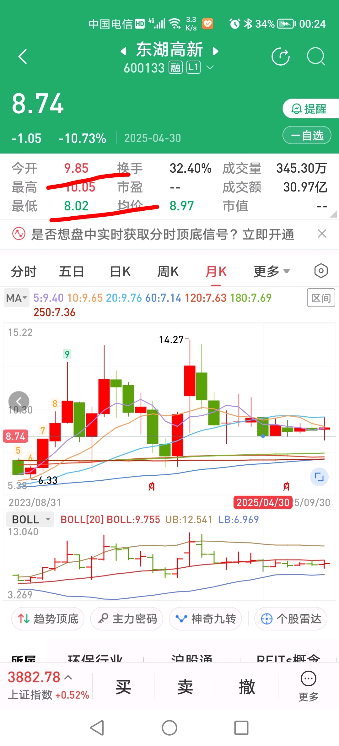 $东湖高新(SH600133)$ 打开月线级别仔细看看东湖的近半年走势,一直围绕着4月的箱体震荡,上方压力位9.85,支撑位8.02,只要这个箱体上下沿不破位,就跟着主力高抛低吸呗,亏也亏不了太多,赚也赚不了多少