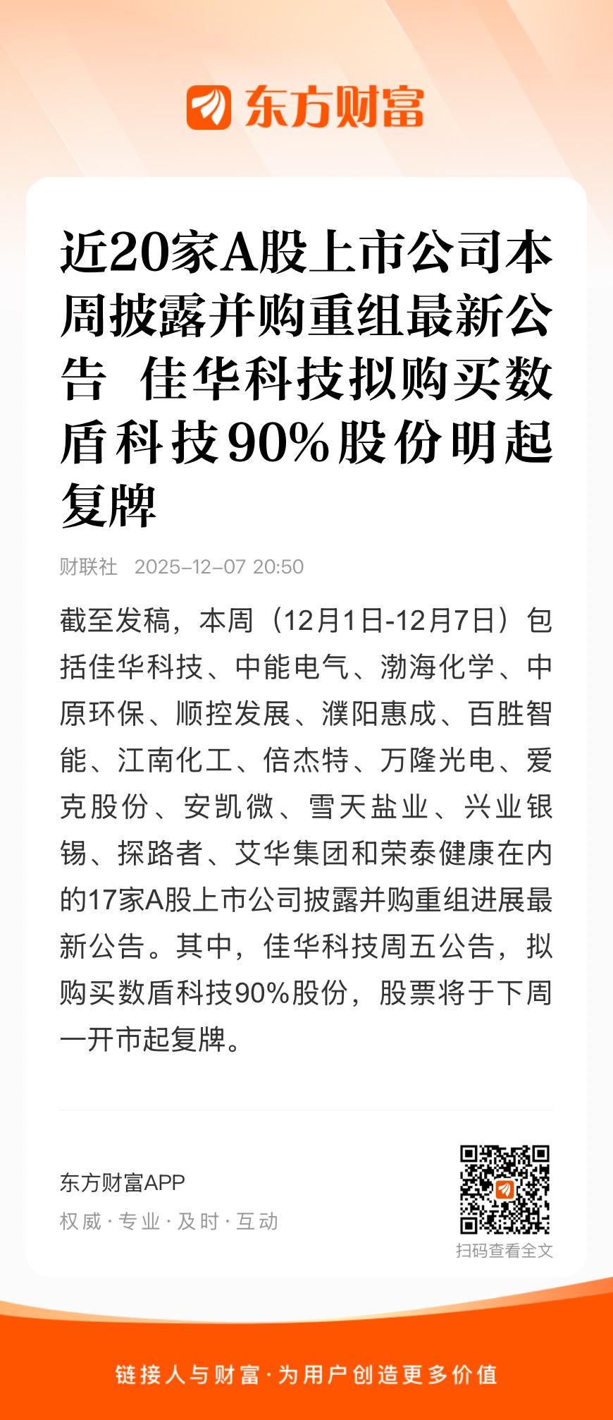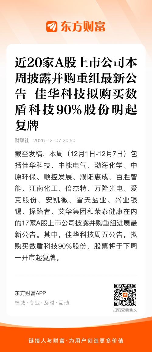 截至发稿,本周(12月1日-12月7日)包括佳华科技、中能电气、渤海化学、中原环保、顺控发展、濮阳惠成、百胜智能、江南化工、倍杰特、万隆光电、爱克股份、安凯微、雪天盐业、兴业银锡、探路者、艾华集团和荣泰健康在内的17家A股上市公司披露并购重组进展最新公告。其中,佳华科技周五公告,拟购买数盾科技90%股份,股票将于下周一开市起复牌。