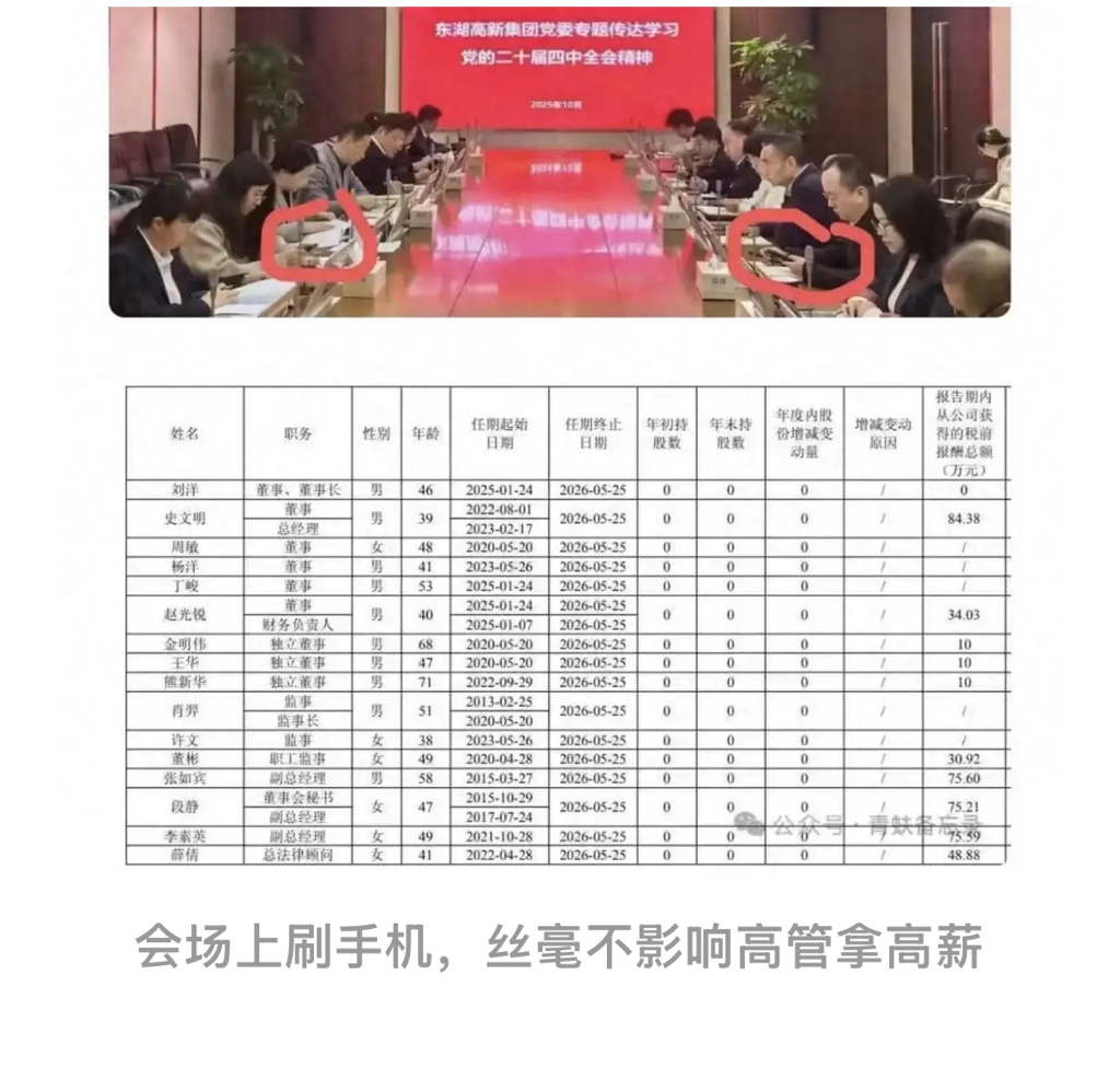更让投资者愤怒的是那张“名场面”照片:官方公众号曾发布高层会议现场图,多位参会人员低头紧盯手机屏幕,毫无议事状态。舆论发酵后,公司竟连夜删图——不是反思治理,而是掩盖问题。