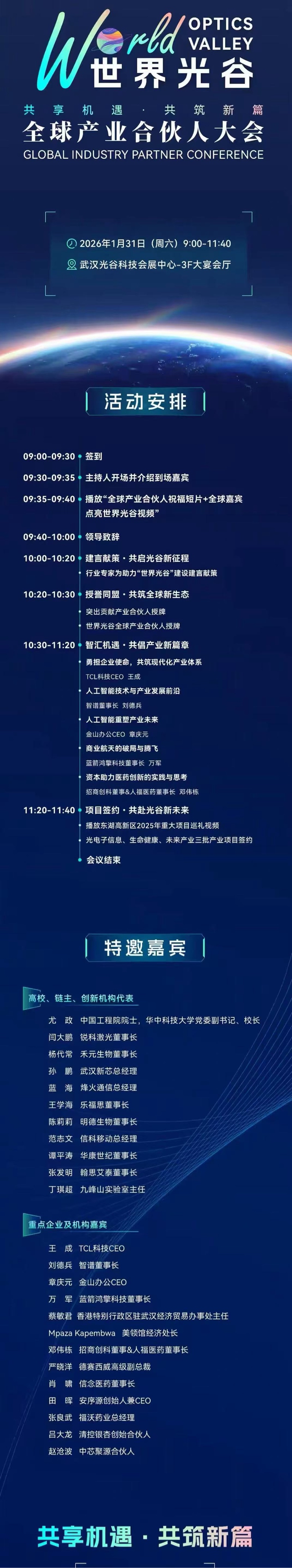 $东湖高新(SH600133)$ 汇聚全球产业力量,共建创新生态。“世界光谷”全球产业合伙人大会将于1月31日在中国光谷科技会展中心召开,约200位来自全球产业、投资与学术领域的重要嘉宾将齐聚光谷,共话前沿趋势、共谋合作发展。