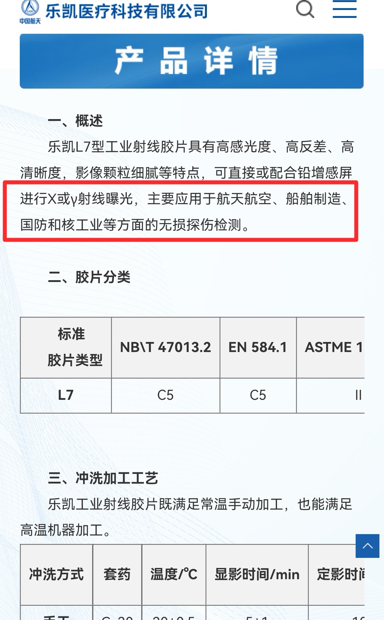 中国航天科技集团乐凯胶片子公司专注于航天火箭、航空、船舶、核工业领域无损探伤!