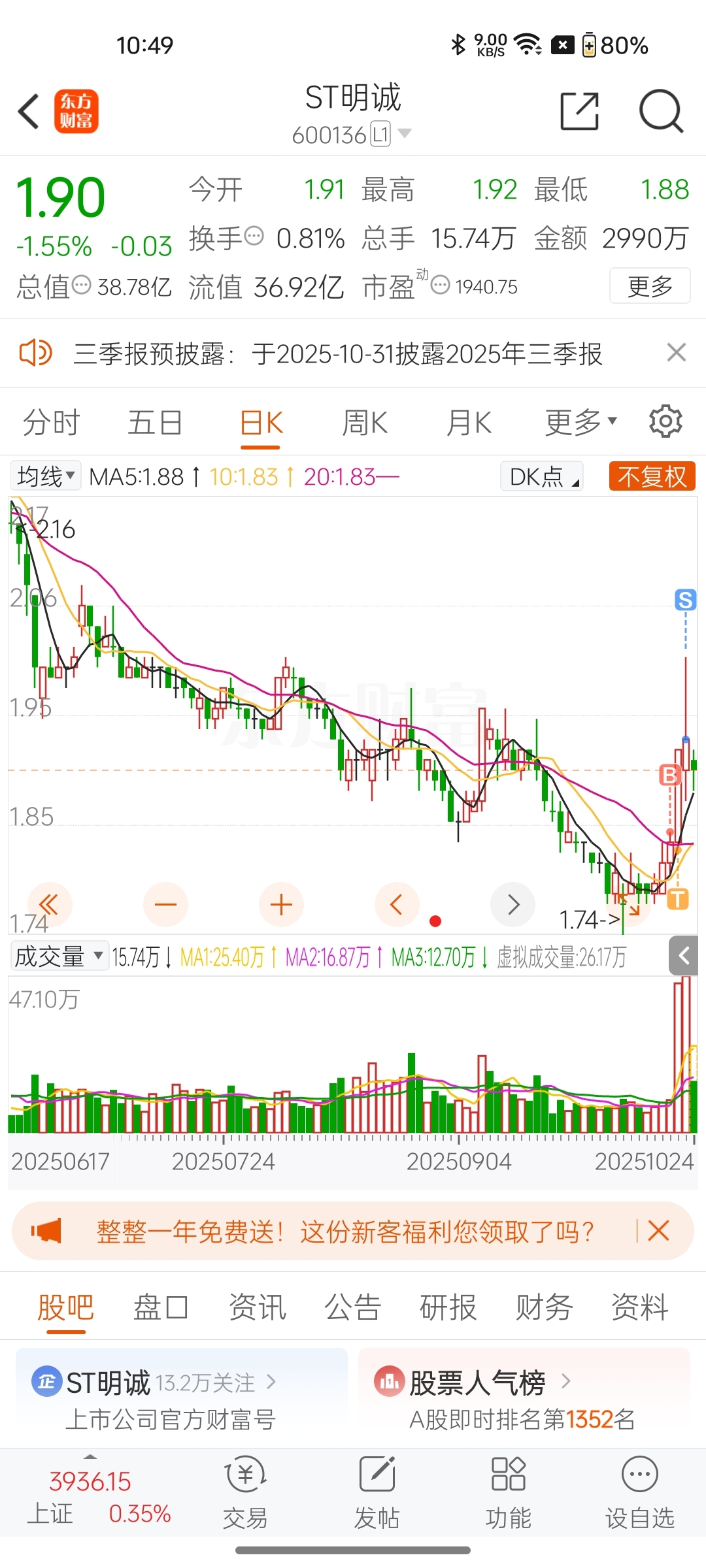 $ST明诚(SH600136)$ 主力既然没格局,我去St交投了!后悔前天加仓导致今天亏的多点!但是没有亏就是赢!