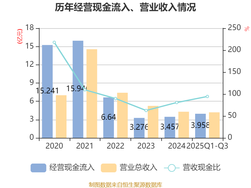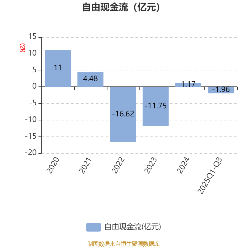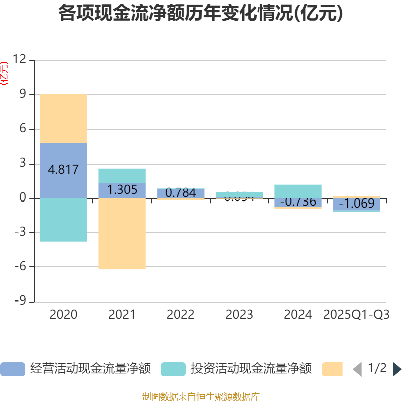 2025年前三季度,公司经营活动现金流净额为-1.07亿元,同比减少1651.27万元;筹资活动现金流净额1613万元,同比增加1657.89万元;投资活动现金流净额-1308.31万元,上年同期为2375.5万元。