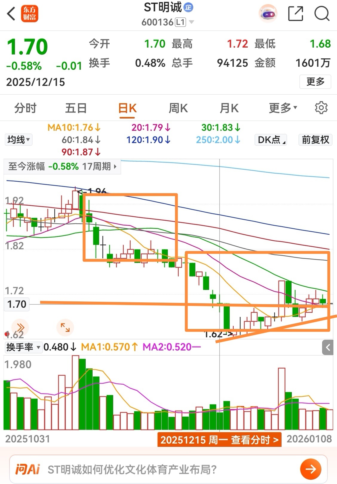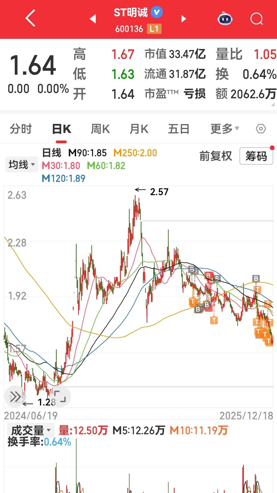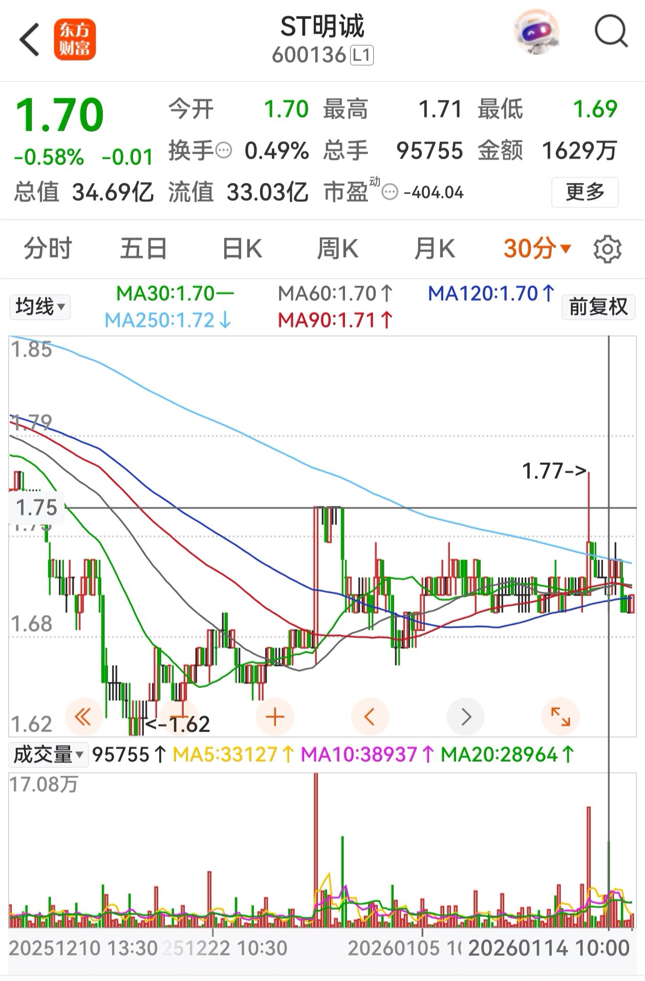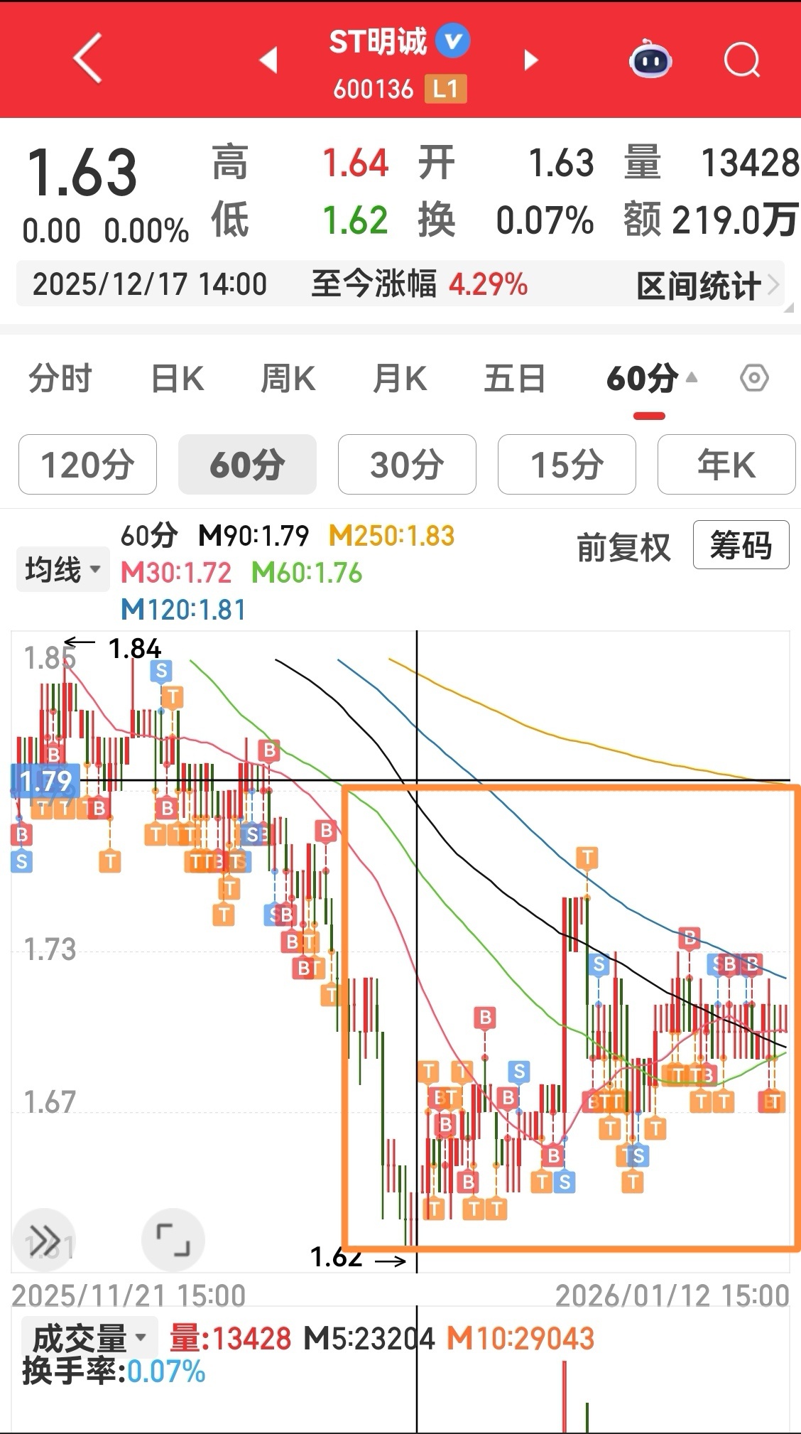 ST明诚,60分钟K线形态与均线形成脚的图形,控制好仓位,适量介入。
