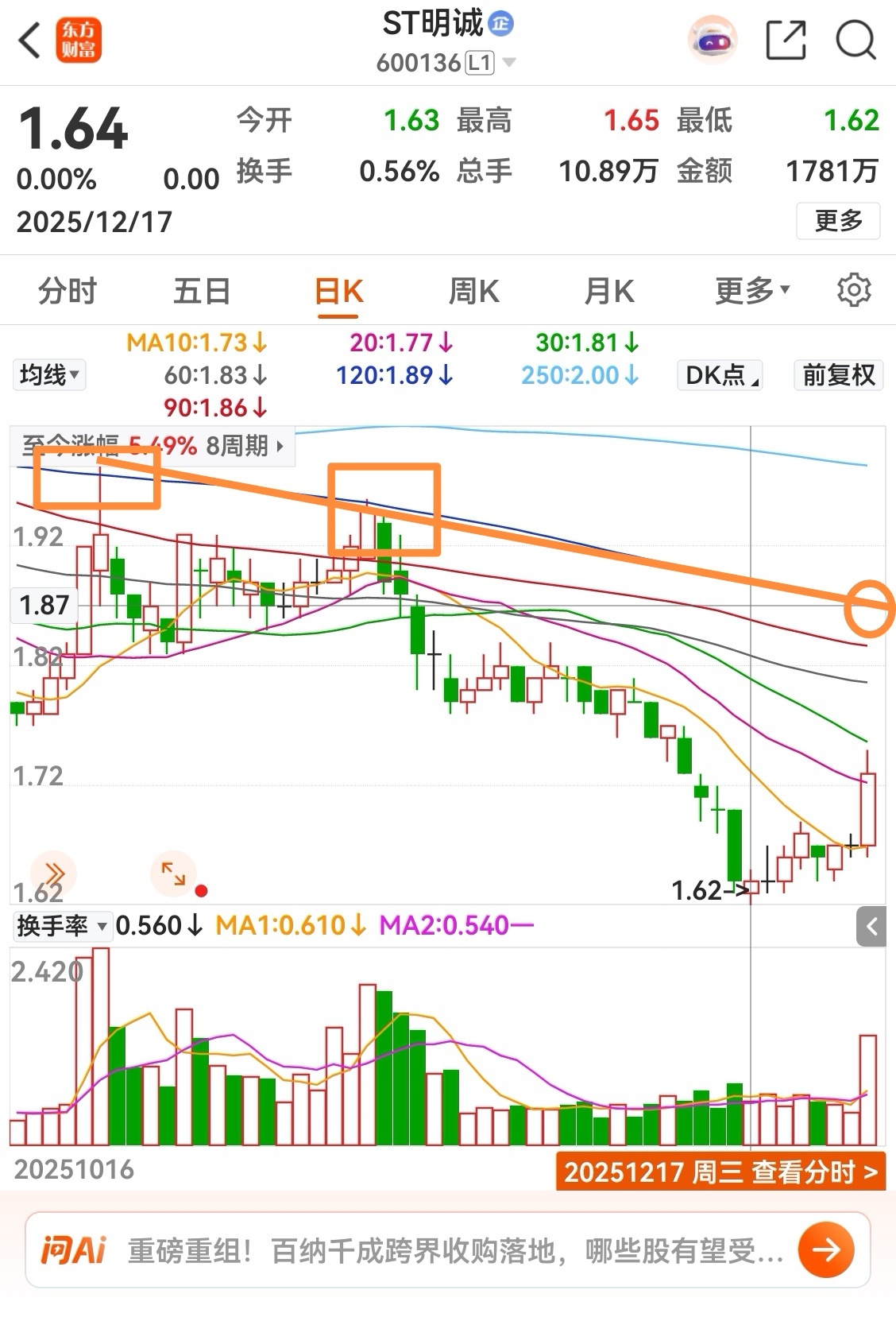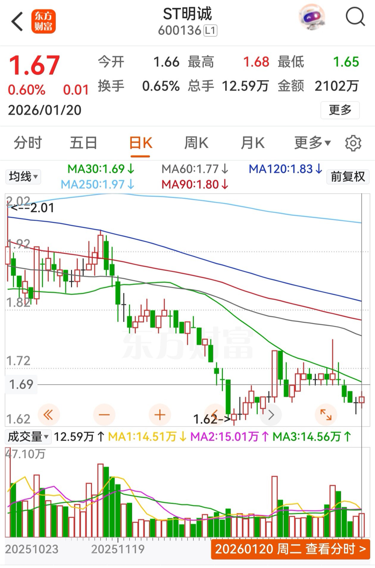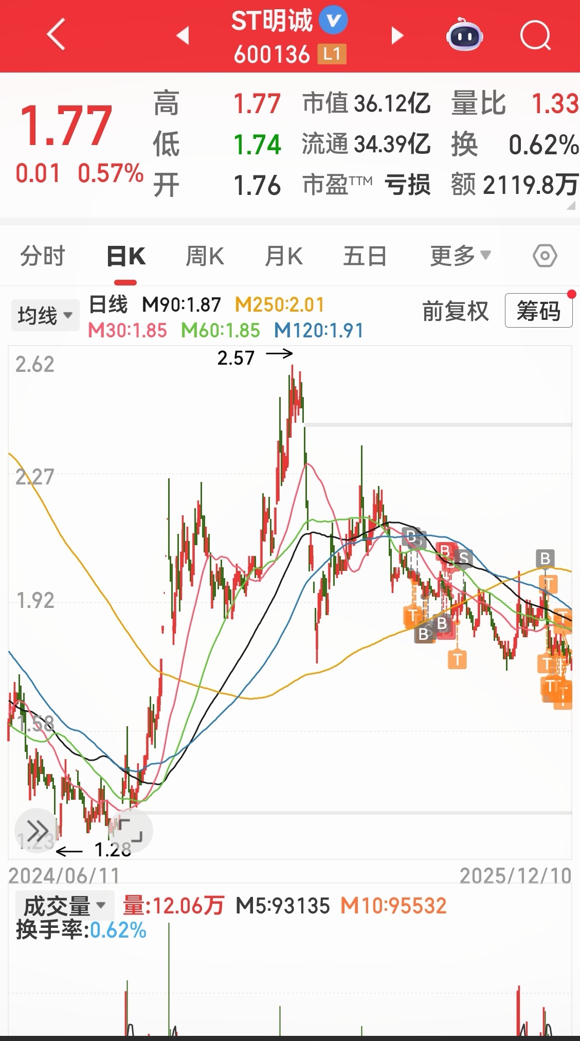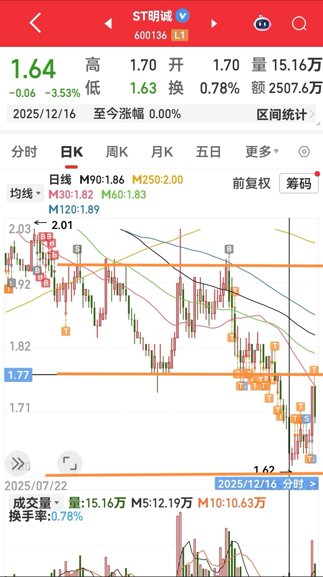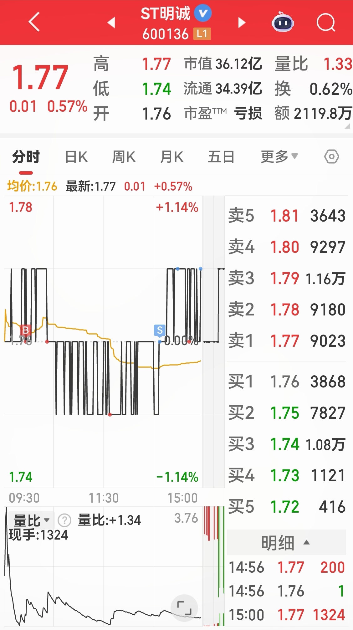 ST明诚,60分钟K线形态与均线形成脚的图形,控制好仓位,适量介入。