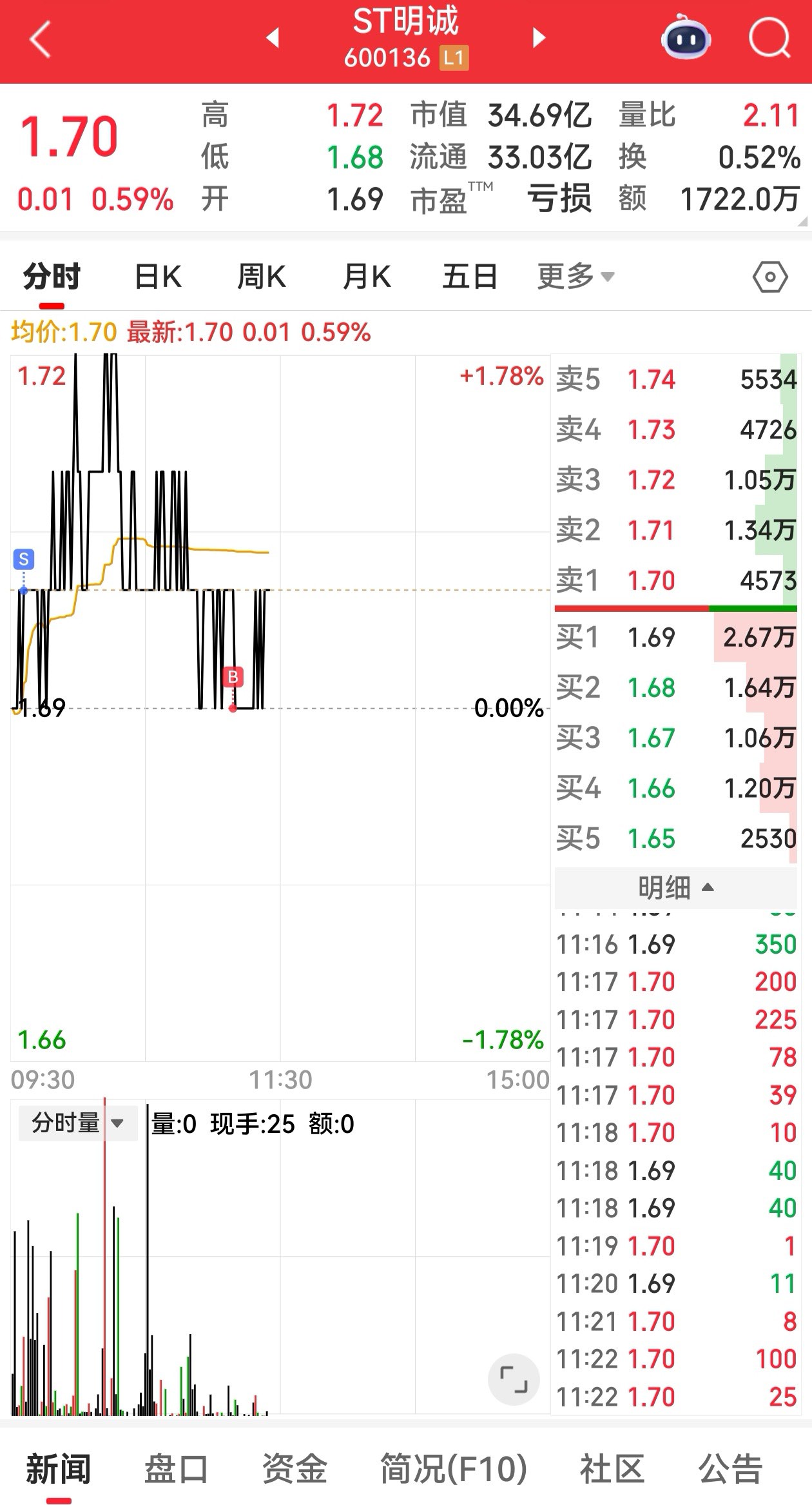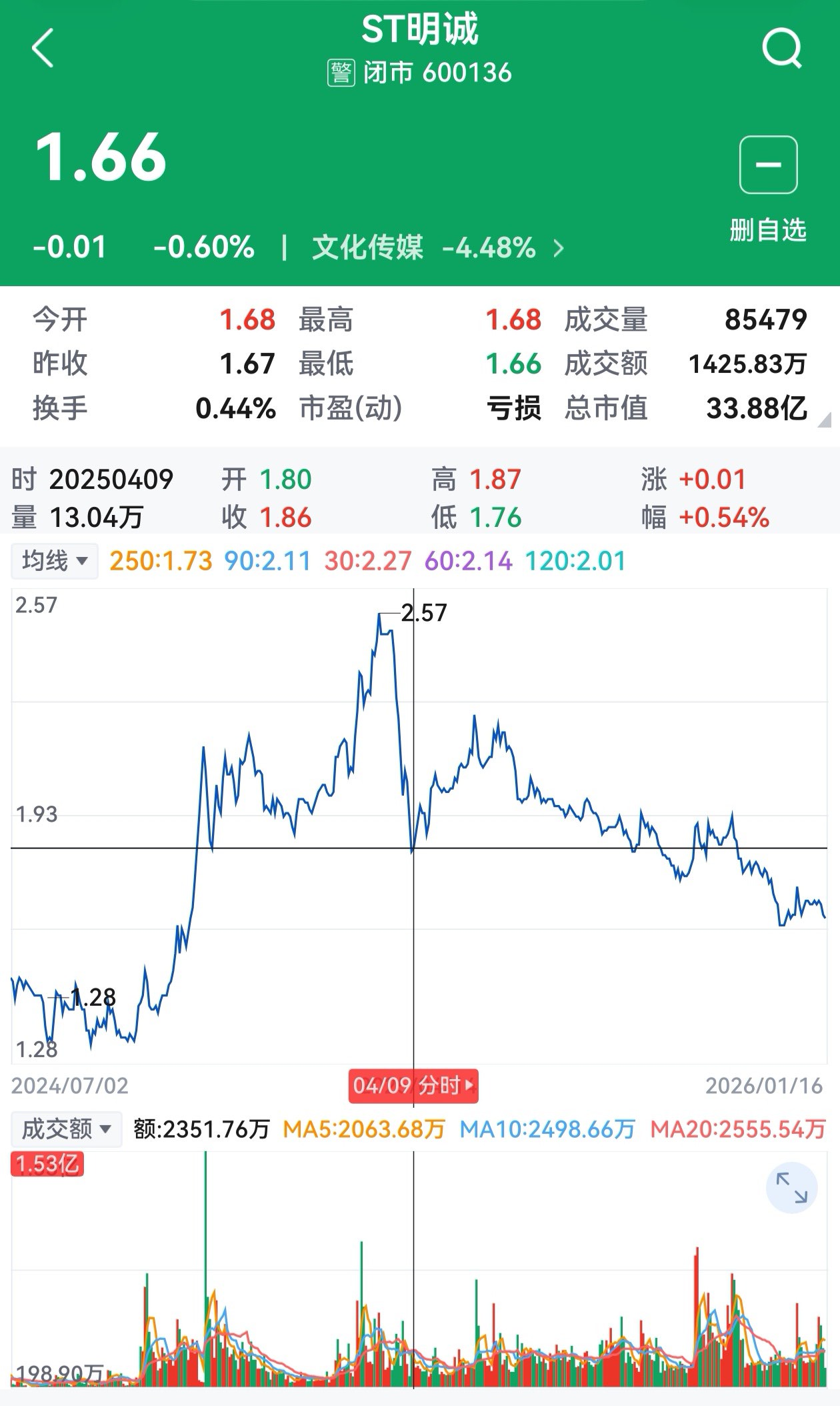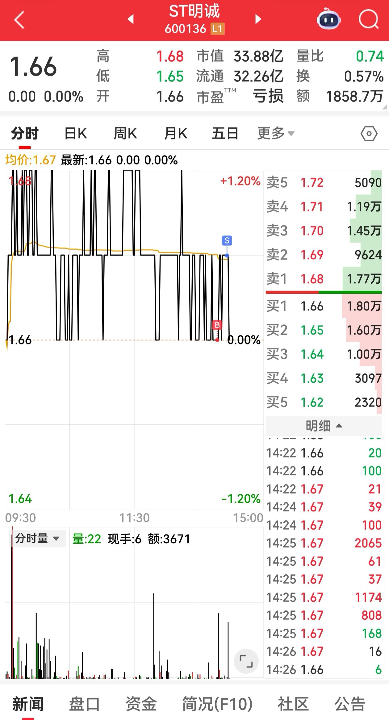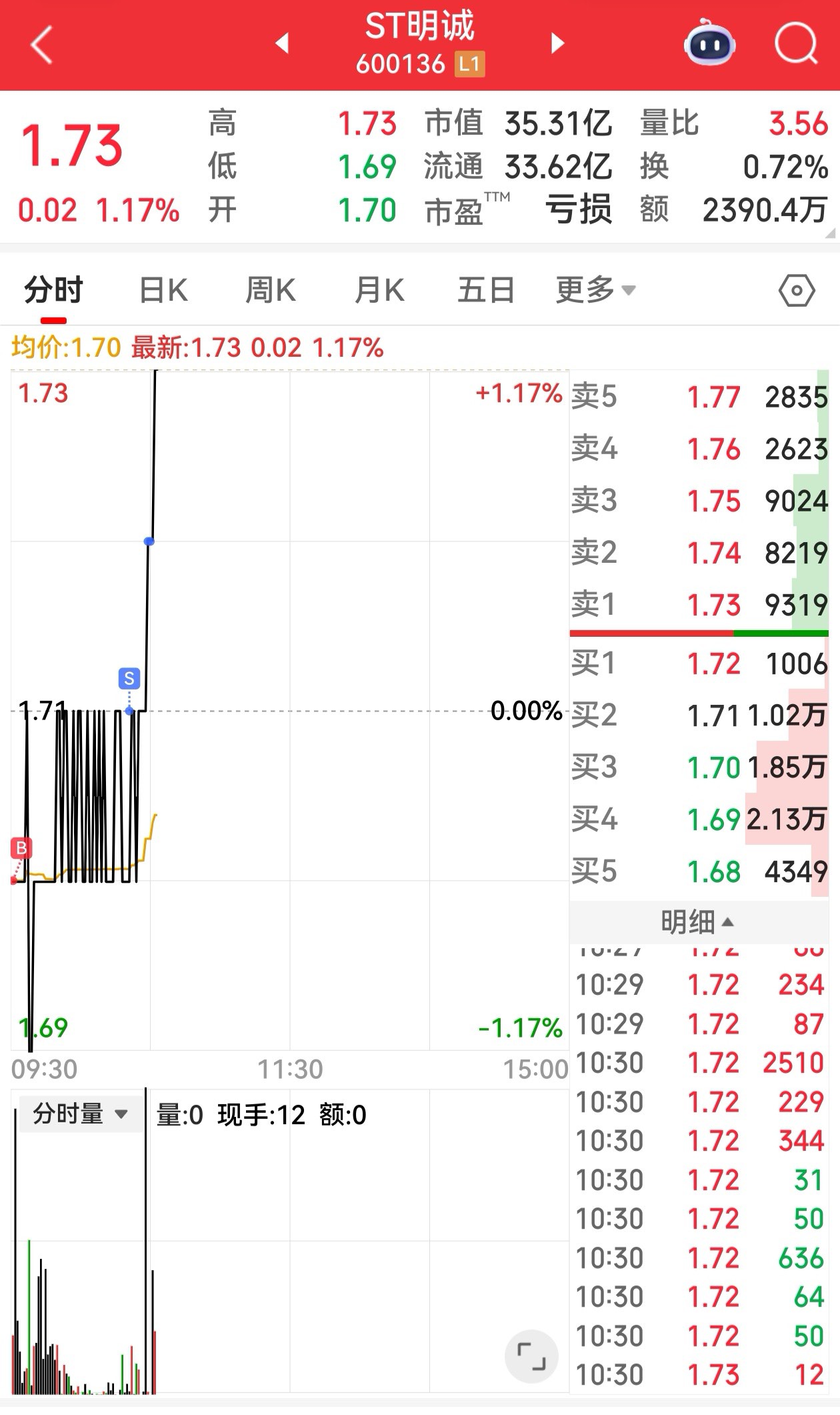 ST明诚,60分钟K线形态与均线形成脚的图形,控制好仓位,适量介入。