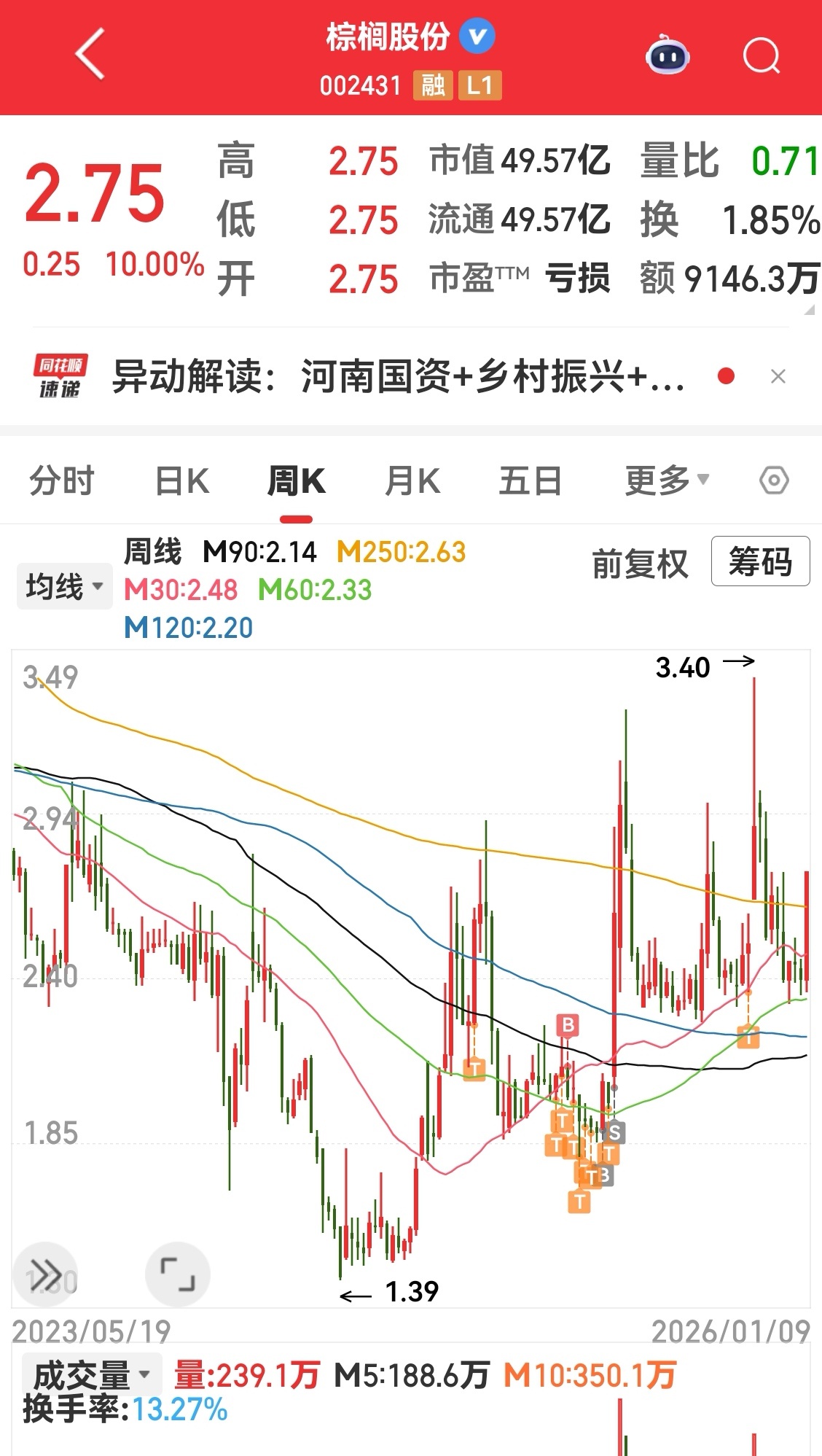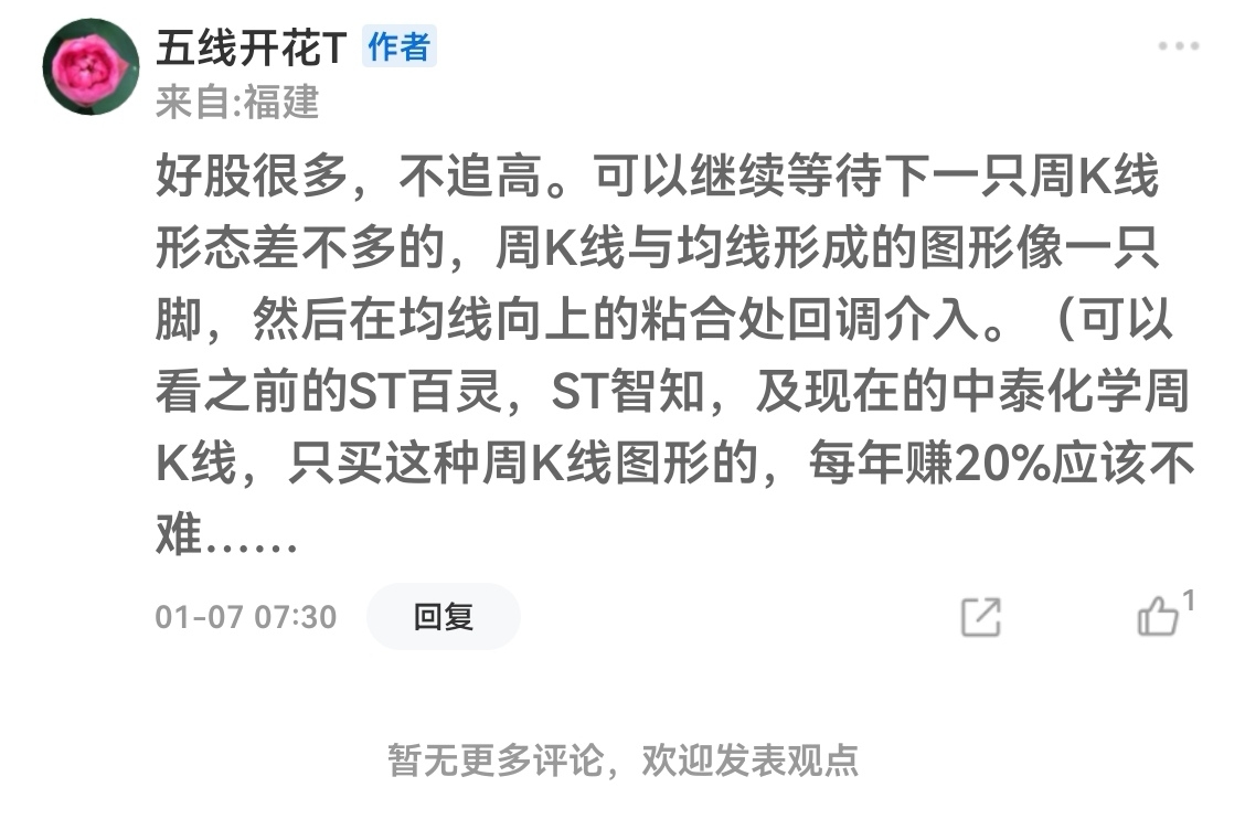 好股很多,不追高。可以继续等待下一只周K线形态差不多的,周K线与均线形成的图形像一只脚,然后在均线向上的粘合处回调介入。(可以看之前的ST百灵,ST智知,及现在的中泰化学周K线,只买这种周K线图形的,每年赚20%应该不难……